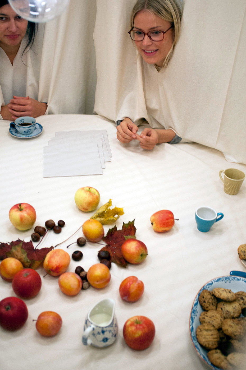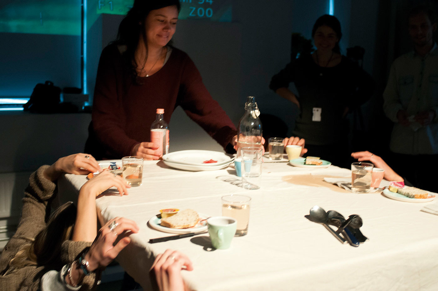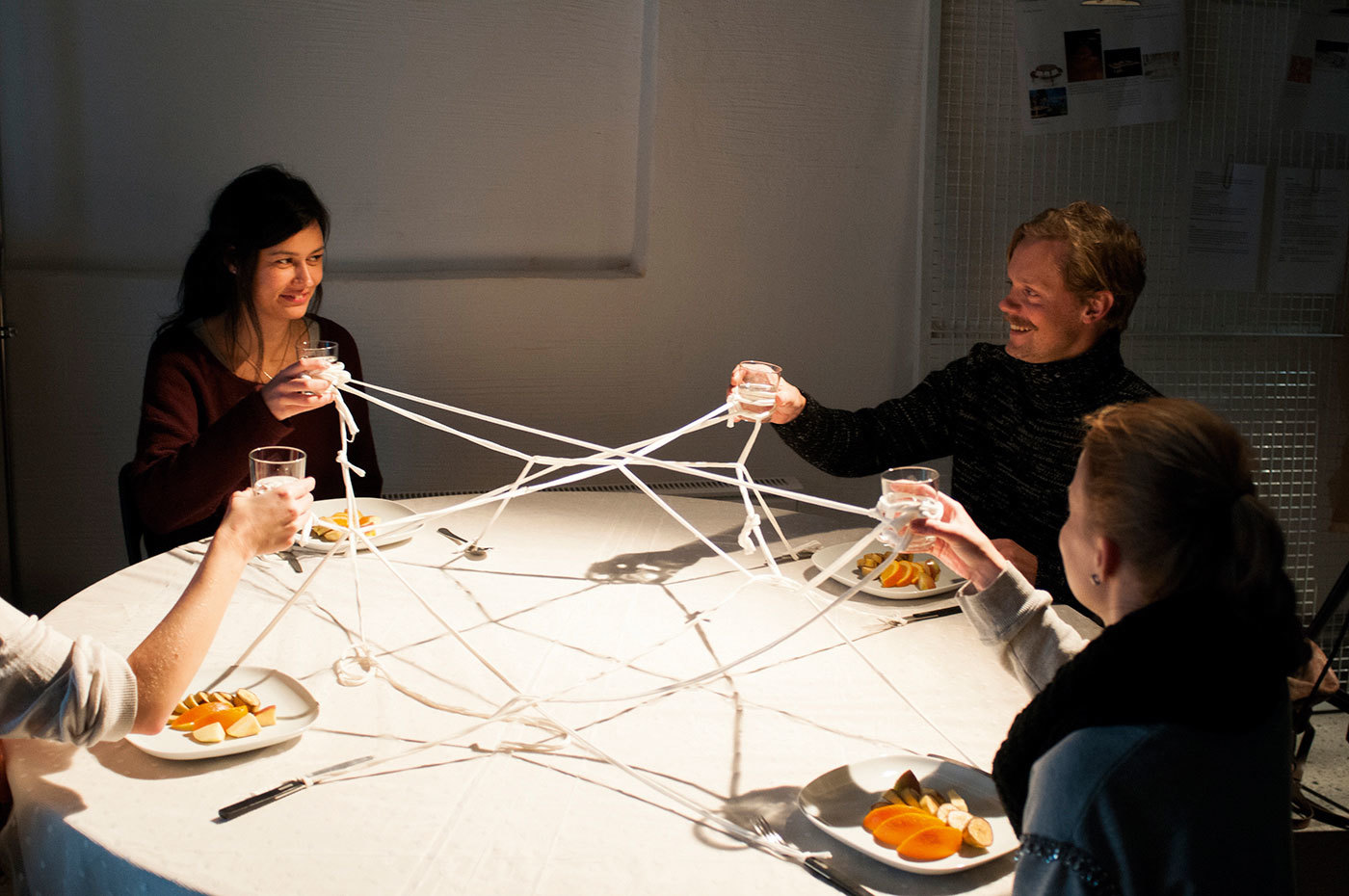 I Bruno Latours aktør-nettverk-teori blir objekter forklart som aktører med intensjoner, tilsvarende levende aktører.2 Objektene blir aktive deltakere i samspillet mellom mennesker, snarere enn verktøy vi bruker. Bordet er altså ikke bare et sosialt redskap, en felles arena for ulike møter, men en aktør som tar del i samspillet mellom oss som befinner oss rundt bordet. Utprøvning av designer Marie Vogelzangs kjente utforming av en festmåltidssituasjon gir erfaringen av materielle sammenstillinger med tydelige intensjoner, og man kan undersøke hvordan individene rundt bordet da oppleves av hverandre.