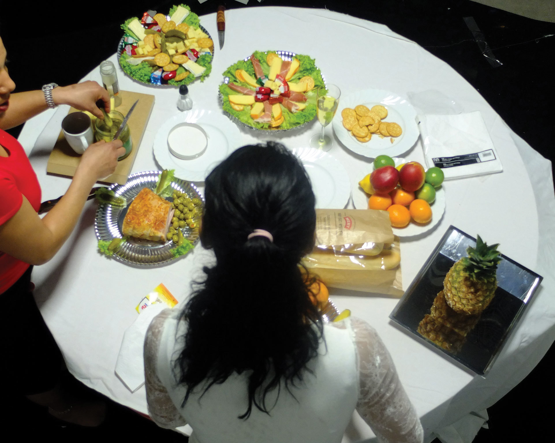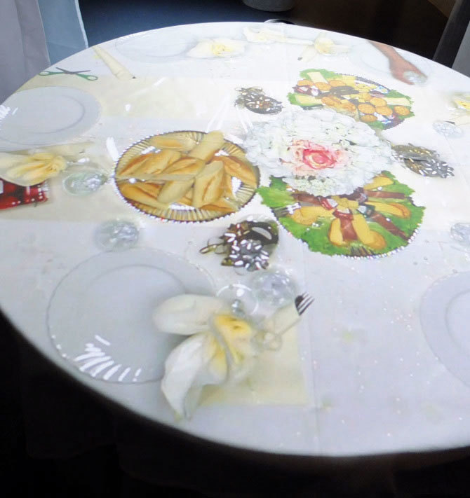 Romni forbereder mat som borddekort til bryllupsfest. Møtene rundt bordet filmes, og blir en del av installasjonen i den ferdige utstillingen.