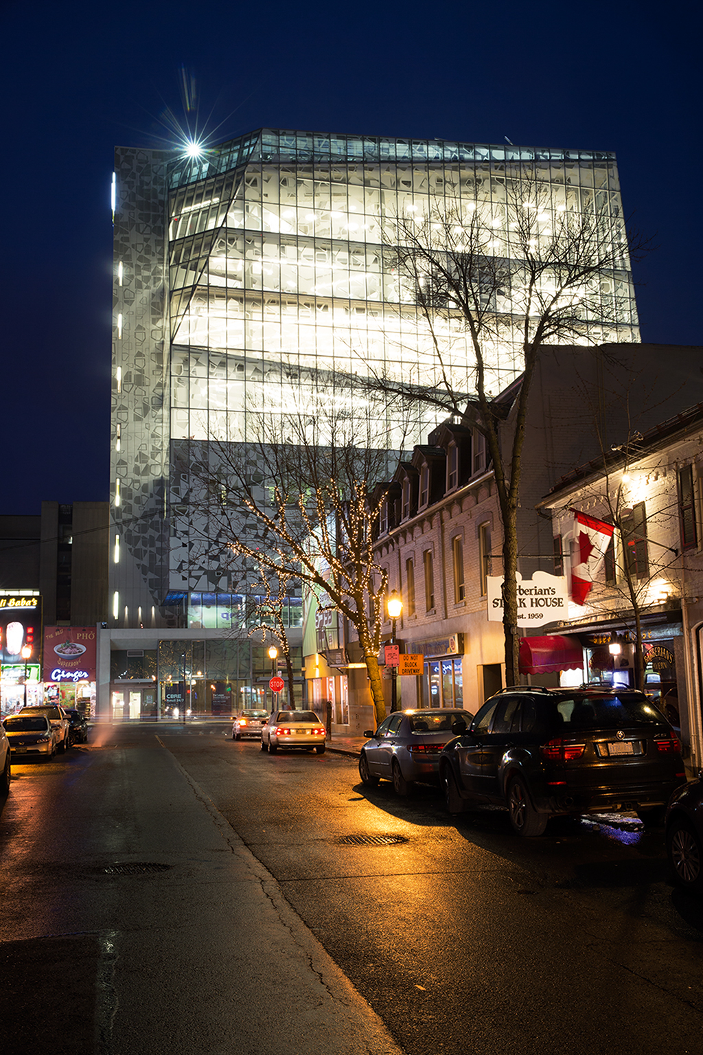 Men ettersom semesteret skrider frem og eksamen nærmer seg, blir studentene sittende her lenger og lenger utover kvelden. Lysene ute i byen slukkes ett for ett, og Ryersons Student Learning Centre blir stående som et lysende landemerke blant gatelyktene.
