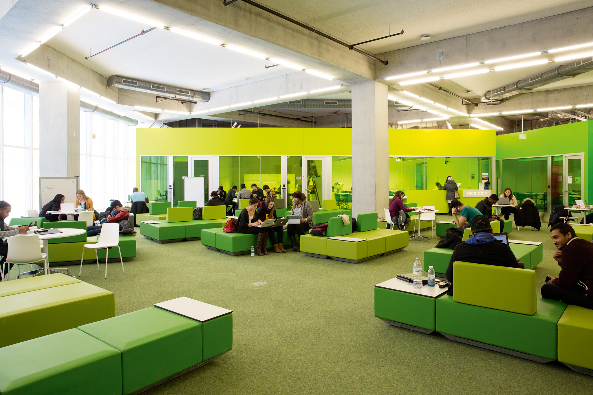 Toronto. Hver eneste krok av det nye Ryerson University Student Learning Centre er fylt av studenter som ser ut til å være i sitt naturlige element. De slenger seg ned i saccosekker og åpner laptopen, fingrene deres beveger seg instinktivt over digitale skjermer for å booke grupperom, og de strør selvsikkert og ubesværet om seg med begreper som samarbeidsrom og engasjement.