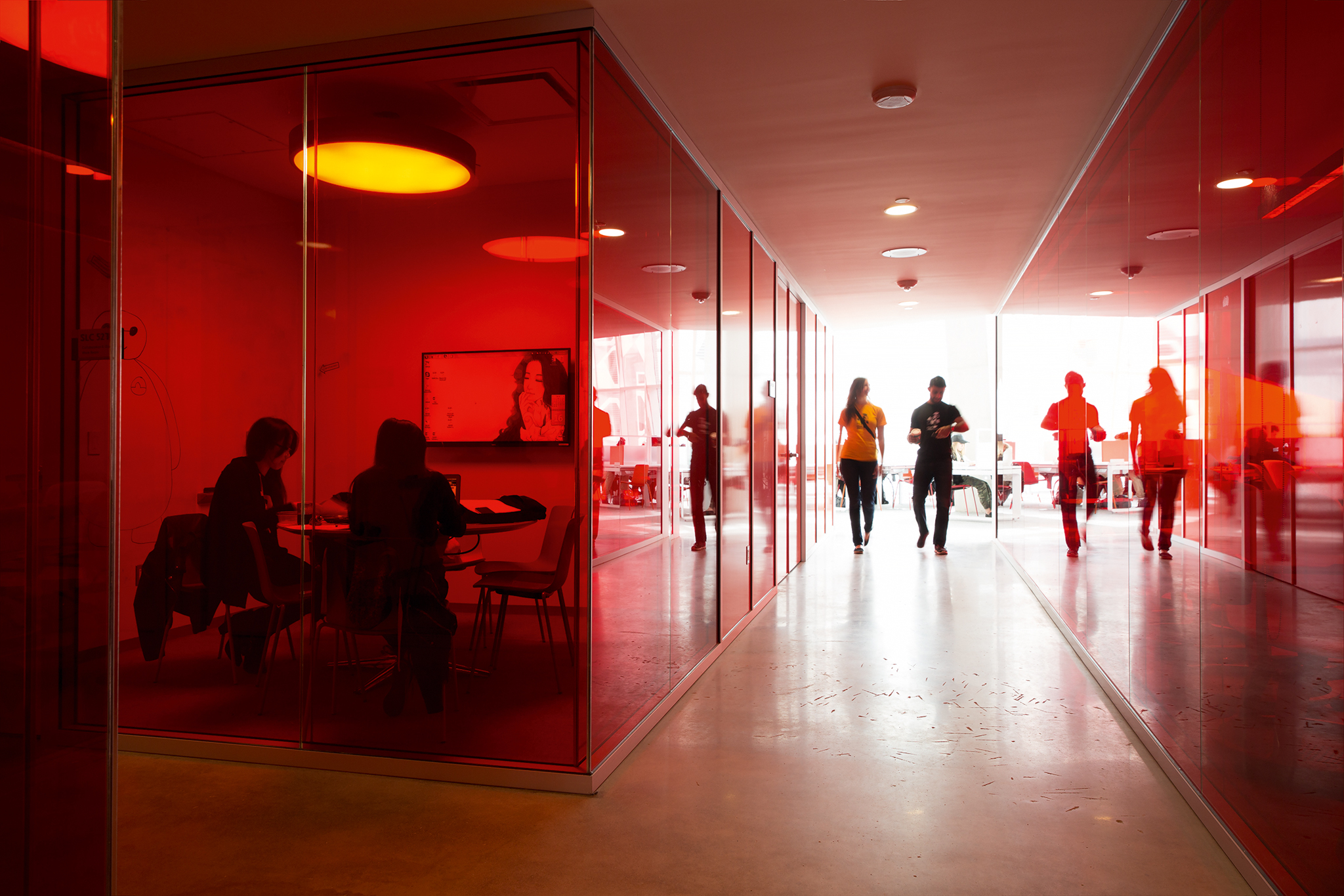 Det er som et ekko av ordene som blinker på skjermene i bygningens elegante, industrielt utformede inngangshall, som også fungerer som amfiteater og kafé, der studentene oppmuntres til å søke jobber som ”fasilitatorer”, ”konsulenter” og ”ambassadører”. Leken animasjonsgrafikk reklamerer for workshops rundt ”lederskap for sosial endring”, og introkurs for innovasjon. En gjeng av dedikerte informasjonsansatte sirkulerer gjennom bygningen, kledd i like t-skjorter og opplært til å svare på spørsmål, gi omvisninger og ta imot forslag til arrangementer og forbedringer.