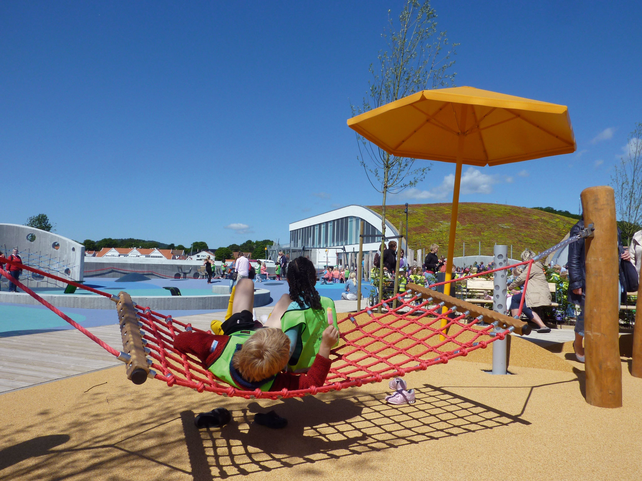 Det kan også være lurt av kommunene å tenke idrett i tilknytning til kultur, mener Rishaug. Dette har Mandal kommune fått til med Buen park, som ligger ved siden av det nye kulturhuset. Parken er egentlig en lekeplass, men laget på en måte som er innbydende for alle, blant annet uten de typiske rød-gul-blå lekeplassfargene.