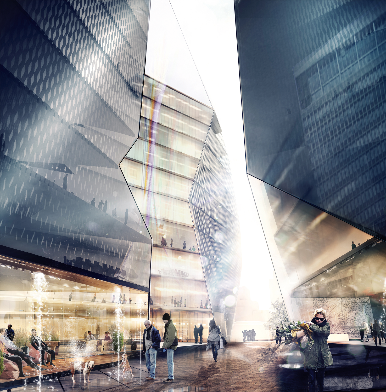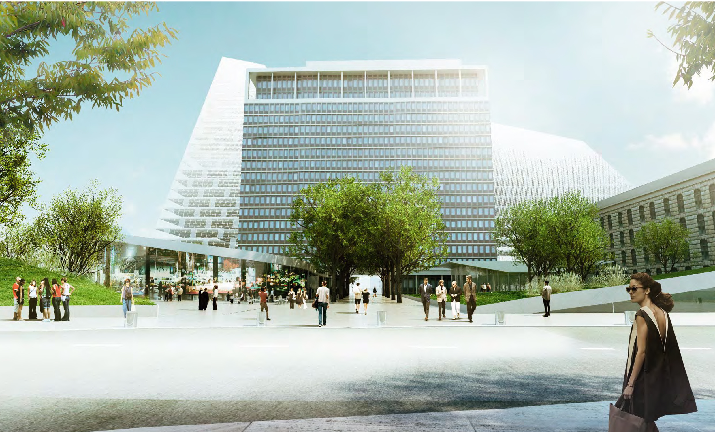 Team BIG, perspective from Akersgata with a new pedestrian access through the existing Høyblokka.