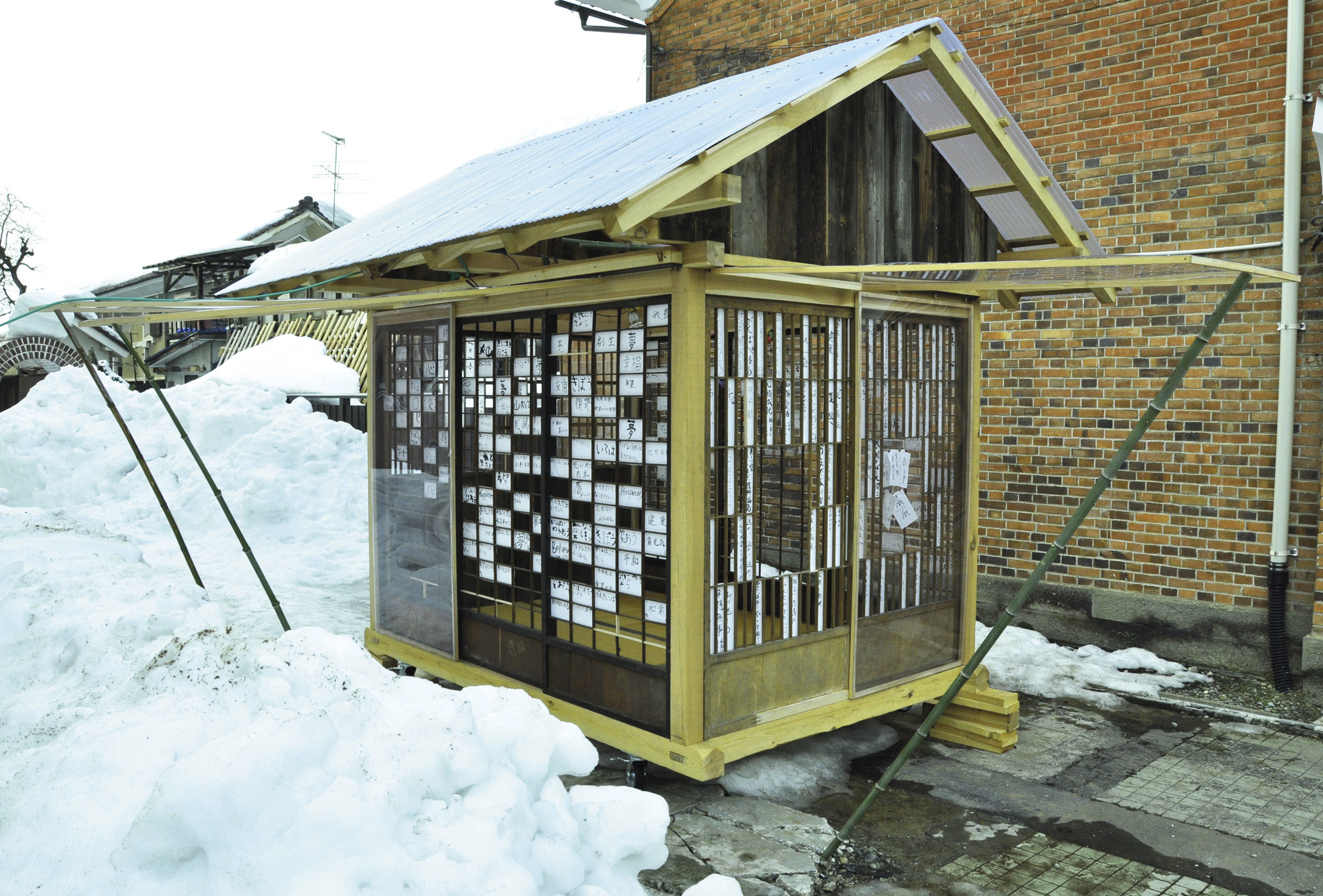 Vi fikk folk til å skrive sine håp for framtiden på papirstykker. Montert på gamle skyvedører kom disse til å utgjøre husets vegger. Den lille bygningen ble plassert inntil byens hovedgate; en markering av inngangen til utstillingen om dagen, og en lysende manifestasjon av folks fremtidshåp om natten. Gjennom byggingen sammen med lokale håndverkere og arkitekter, og gjennom åpne teseremonier i det ferdige rommet, kom ulike folks erfaringer og tanker fram; opplevelser fra tsunamien og dagene etter, historier fra venner og familie, og refleksjoner over situasjonen i regionen og landet, så vel som i verden, i forhold til matvareproduksjon og energiforbruk. Byggeprosessen ble dermed en viktig del av resultatet.