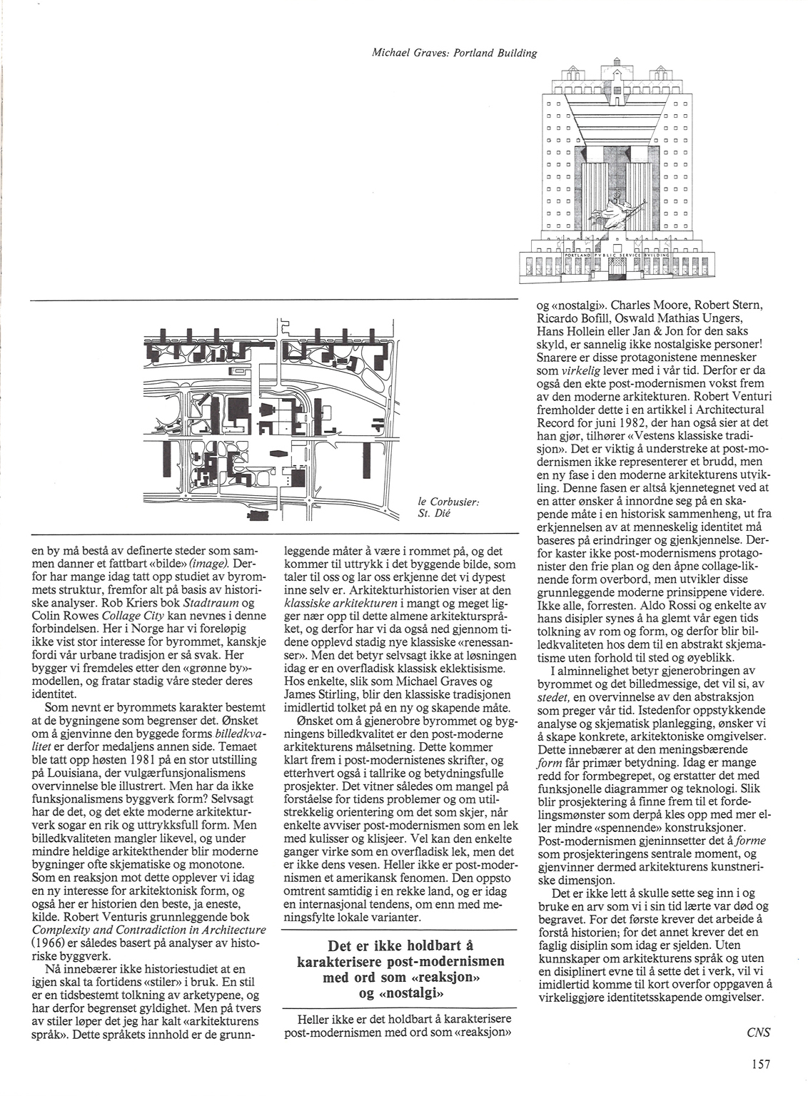 Begynnelsen av 1980-årene markerte overgangen fra "tilpasningsarkitektur" til det som senere er kalt postmodernismen i Norge. CNS' artikkel knyttet an til tidens internasjonale arkitekturdebatt. Fra Byggekunst nr. 4-1983.