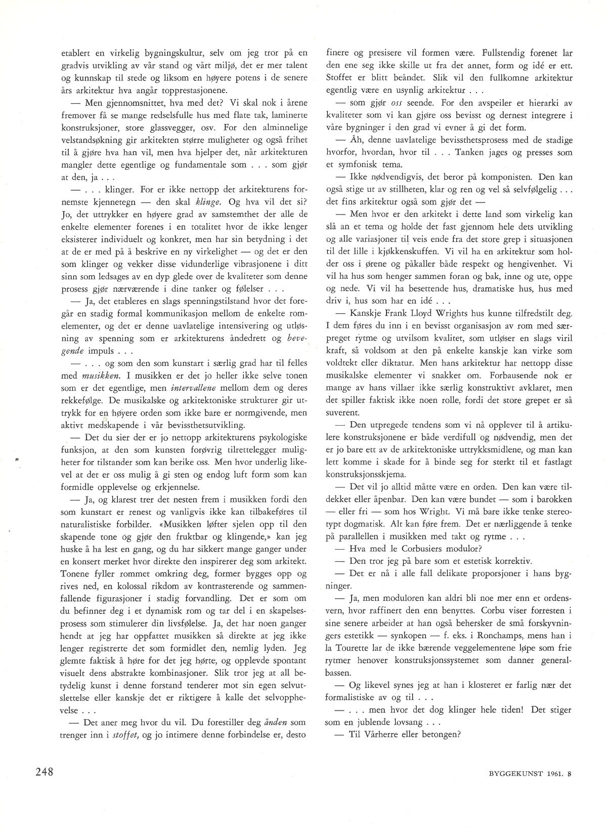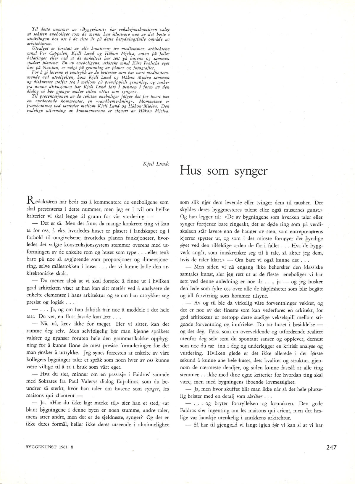 Artikler / Historie, teori Hus som synger Av Kjell Lund Publisert på nett 11. september 2018. Opprinnelig publisert i Arkitektur N nr. 8 – 1961. For å få full tilgang på alt innhold i Arkitektur N kan du kjøpe eller abonnere på papirutgaven. Kopiere lenke til «Hus som synger» 2