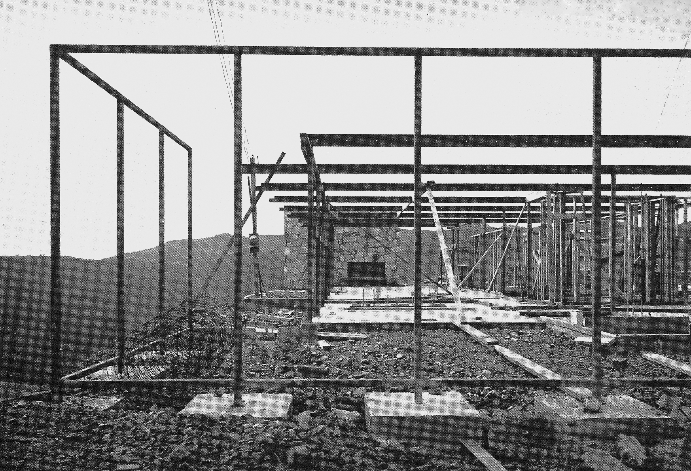 Stålkonstruksjonen i Craig Ellwoods Case Study House nr. 16 (1951) under bygging. Publisert i Arts and Architecture.