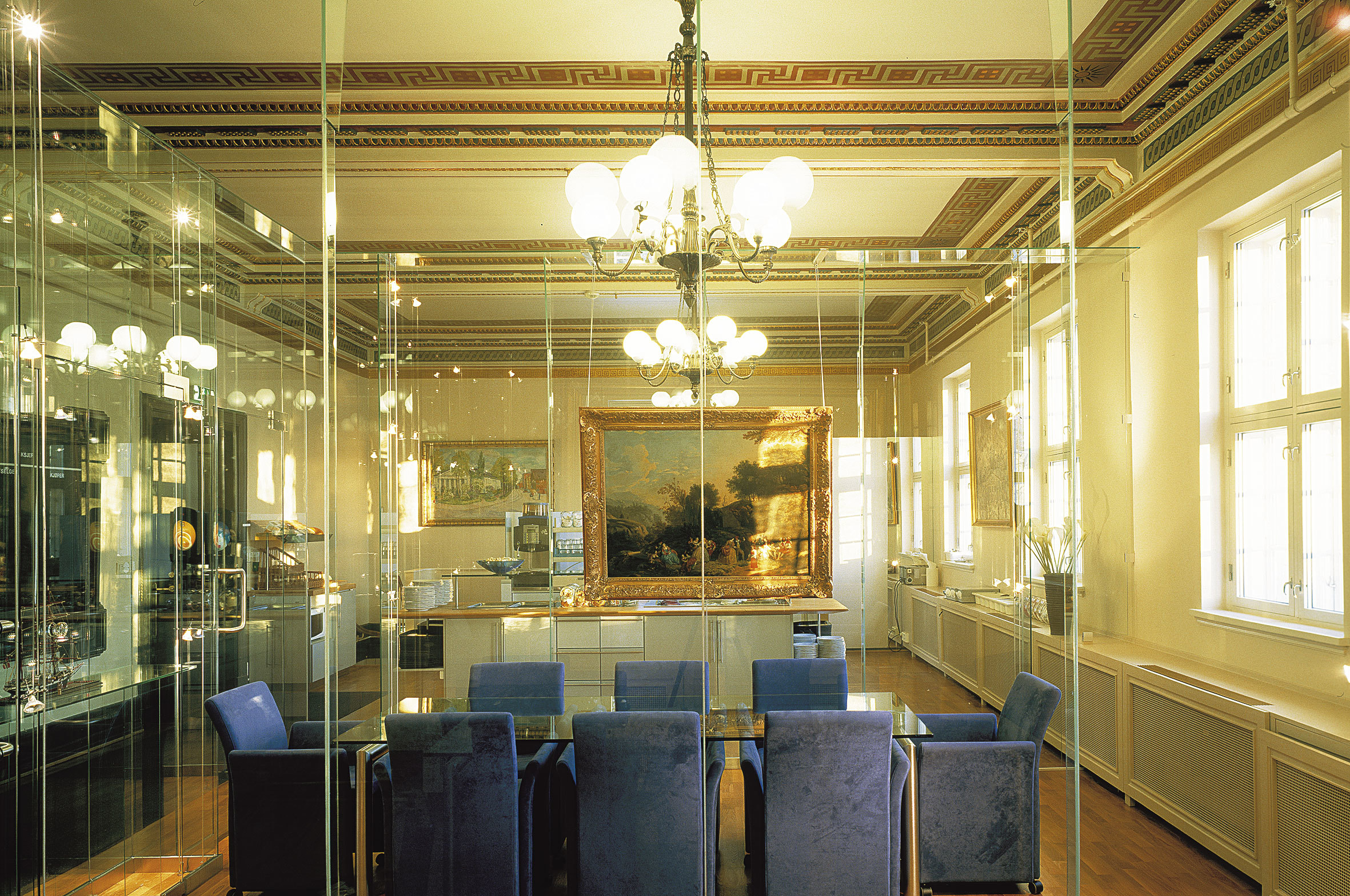 Niels Torp’s present refurbishment is the last of many adjustments. The interiors have been opened and brought together: The trading hall volume is reinstated with an increased number of workspaces on two levels. The alterations are clearly thought out and delicately detailed, within the spirit of the building. New suspended panels hiding up-to-date services and technical installations contrast the old decorated ceilings, and new glass partitions allow the separation of new functions without altering the original volumes. This approach is characteristic for our time: We avoid taking a stand by using materials that are, seemingly, not there – an acceptable solution because it touches as little as possible, elegant and practical, but it nonetheless leaves you with the uncomfortable feeling that it is not complete.