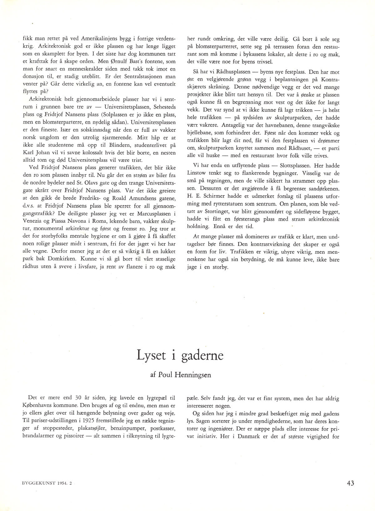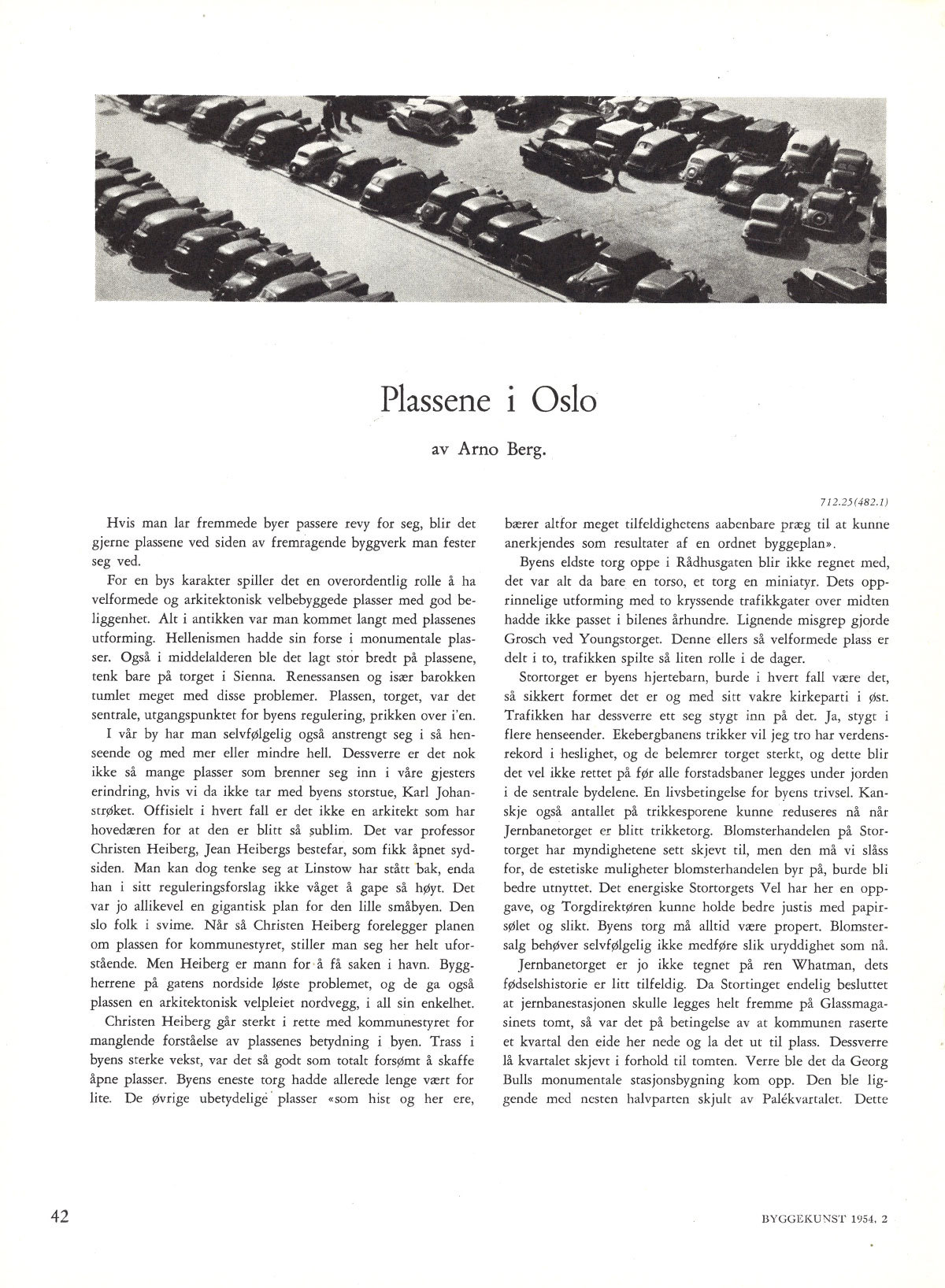 Artikler / Plan Plassene i Oslo Av Arno Berg 1 Publisert på nett 04. november 2019. Opprinnelig publisert i Arkitektur N nr. 2 – 1954. For å få full tilgang på alt innhold i Arkitektur N kan du kjøpe eller abonnere på papirutgaven. Kopiere lenke til «Plassene i Oslo»