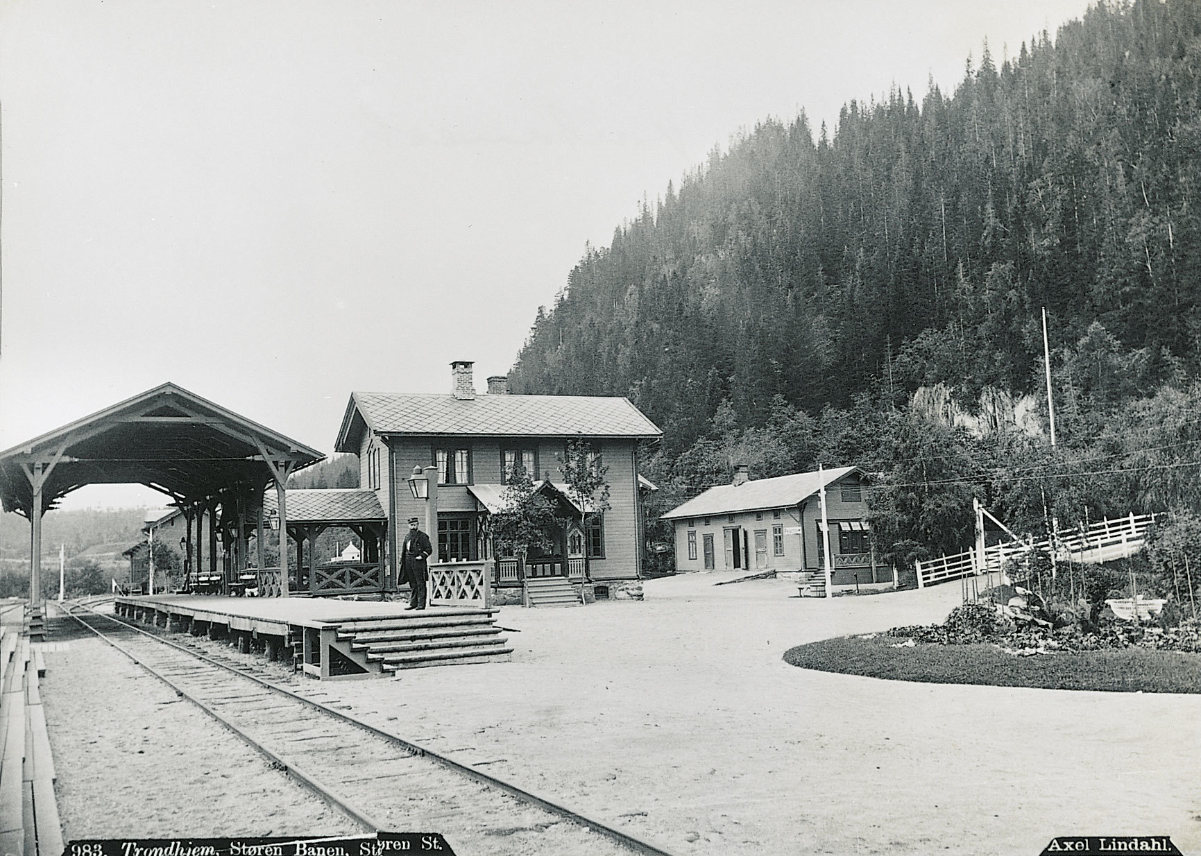Til venstre: Støren jernbanestasjon – prosjektert og bygget i 1860-årene, fotografert i 1883. I sveitserstilens første fase var dette den offisielle byggestilen i tre. Sveitserstilen symboliserte det moderne Norge, og ble ofte benyttet av arkitekter, i for eksempel hoteller, jernbanestasjoner og de nye tettstedene. Arkitekt: G.A. Bull.