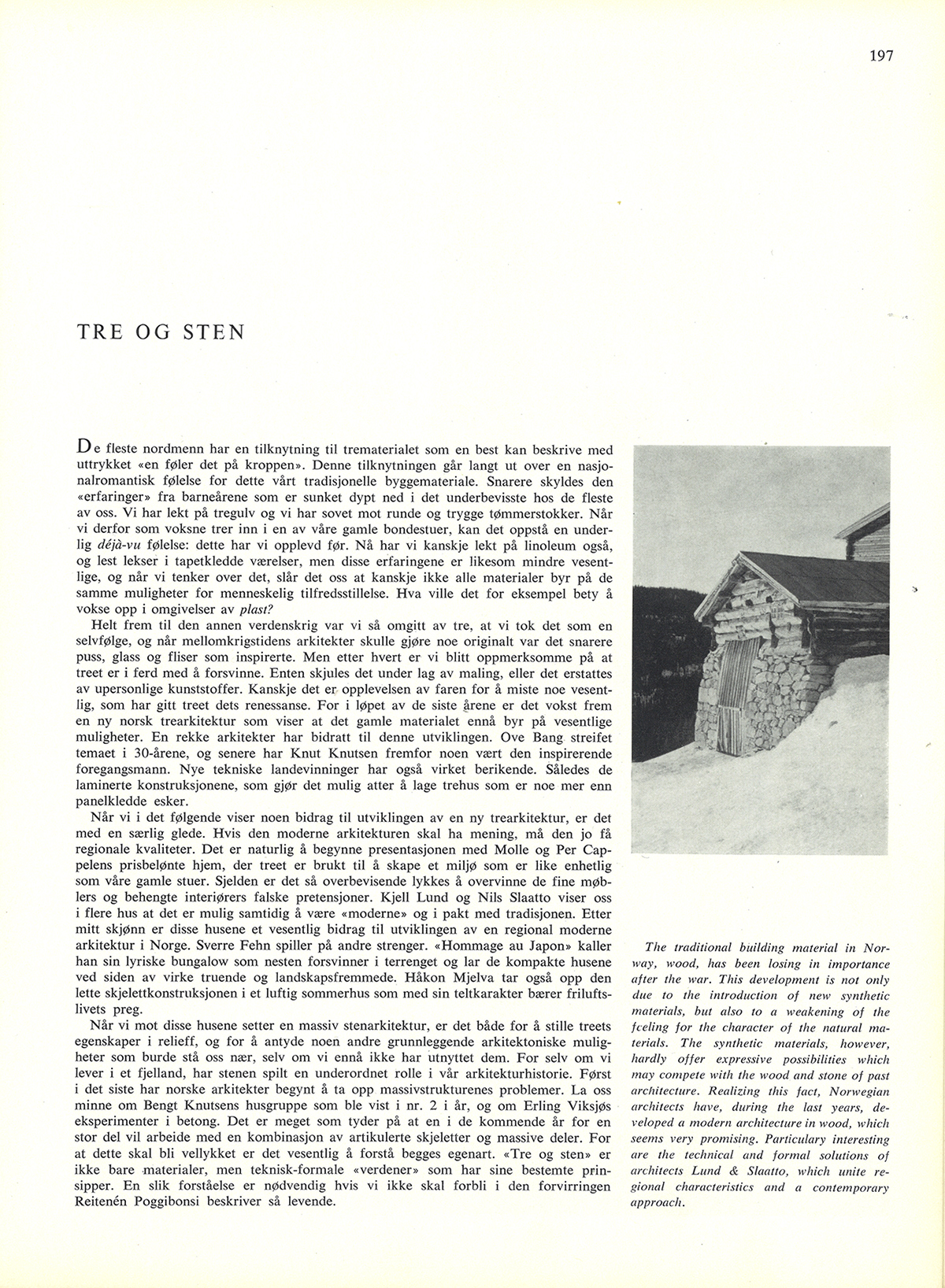Artikler / Leder Tre og sten Av Christian Norberg-Schulz Leder Byggekunst nr.8 1964 Publisert på nett 14. mars 2019. Opprinnelig publisert i Arkitektur N nr. 8 – 1964. For å få full tilgang på alt innhold i Arkitektur N kan du kjøpe eller abonnere på papirutgaven. Stikkord håkon mjelva Sverre Fehn lund & slaatto Kopiere lenke til «Tre og sten»
