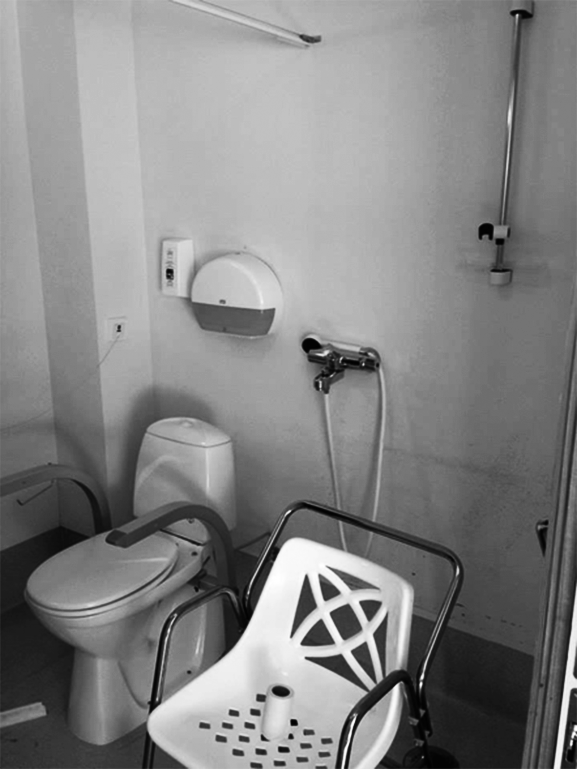 Tre av bueiningane hadde takheisskinner på bad. Ingen sjukeheimar hadde gjennomgåande takheisskinner mellom bebuarrom og bad, så pleiar måtte kople bebuar av skinna i bebuarrommet, for så å kople bebuar på att på badet.19