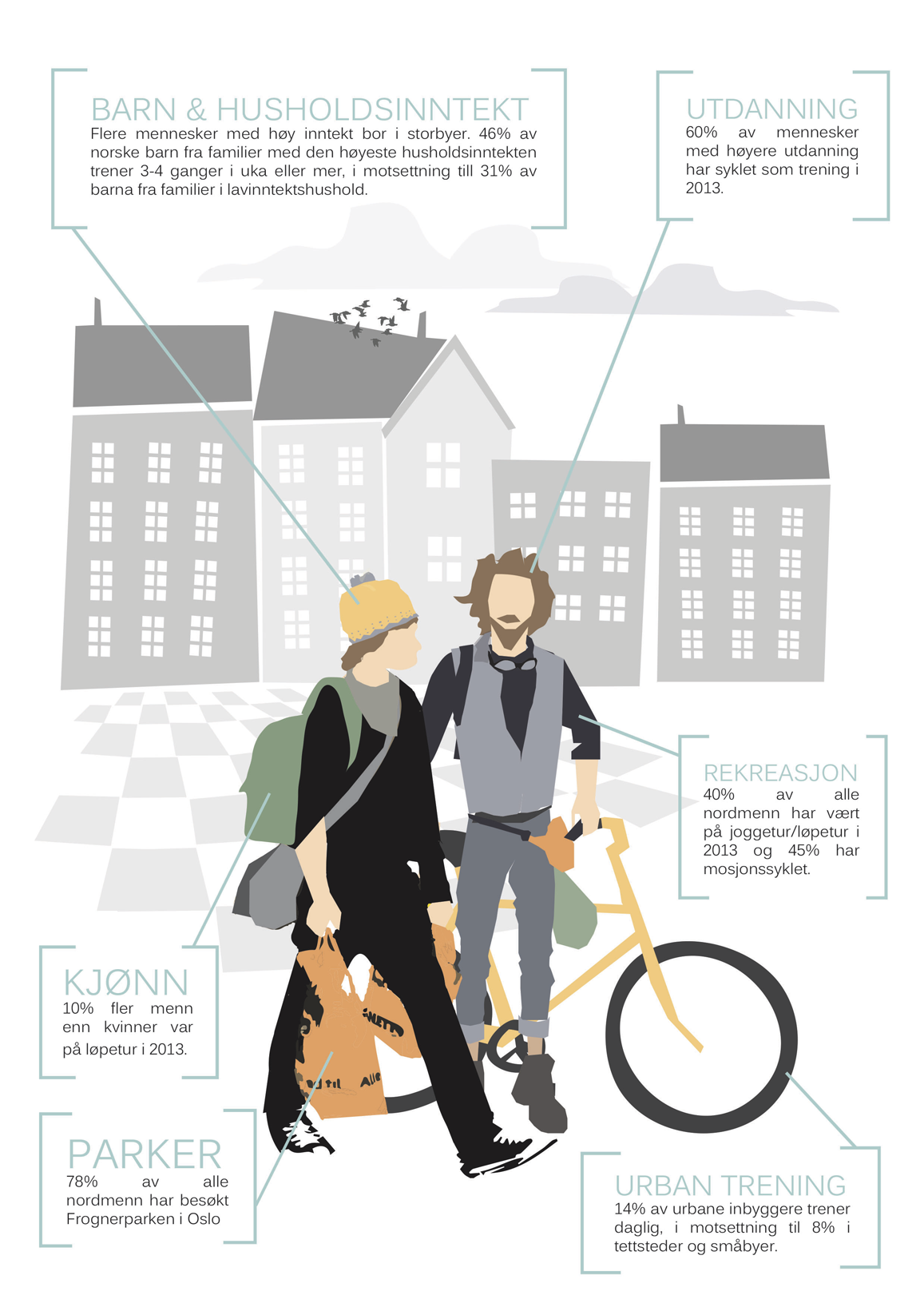 Det et stort antall nordmenn som regelmessig jogger (40%) eller sykler (45%), begge aktiviteter som enkelt og billig kan utøves omtrent overalt både i naturen og urbane rom.22 Å sykle og jogge er aktiviteter som krever lite annet enn infrastrukturen for fotgjengere og syklister, mens mange alternative utendørsaktiviteter med langt færre utøvere ofte krever kostbare investeringer i blant annet utstyr, transport og reise (for eksempel basehopp og frikjøring på ski). Etablering av infrastruktur som passer for mange i en urban kontekst kan være avgjørende for å unngå den sosiale ekskluderingen av visse demografiske grupper man tidvis finner innenfor “elite” friluftslivaktivitetene, en ekskludering som sentrerer seg rundt økonomiske forbrukerfellesskap (utstyr, transport og reise).