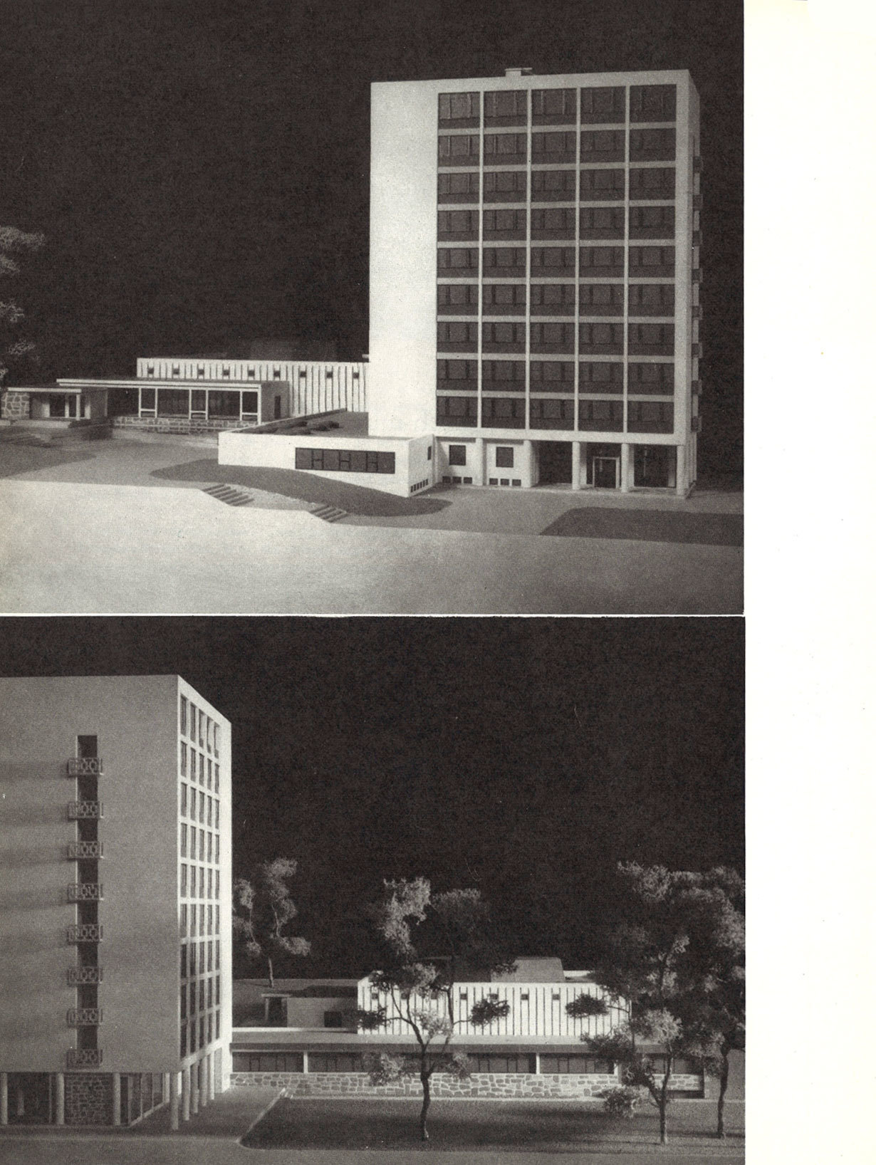 Modell og plantegning. Høyblokken er kontorbygg for Havforskningsinstituttet. Akvariet holder til i det lave bygget og var ved åpningen 27. august 1960 Nord-Europas største og mest moderne akvarium.