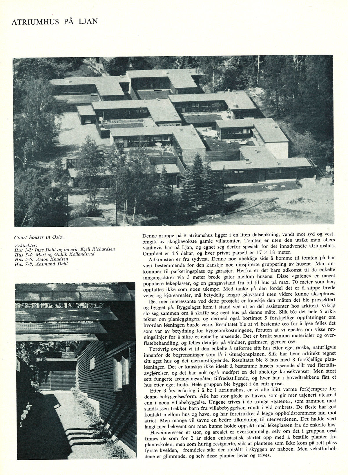 Gruppe med 8 atriumshus i en liten dalsenkning, vendt mot sør og vest, omgitt av skogbevokste gamle villatomter. Tomten var uten den utsikten man ellers har på Ljan, og egnet seg derfor spesielt for det innadvendte atriumshus.