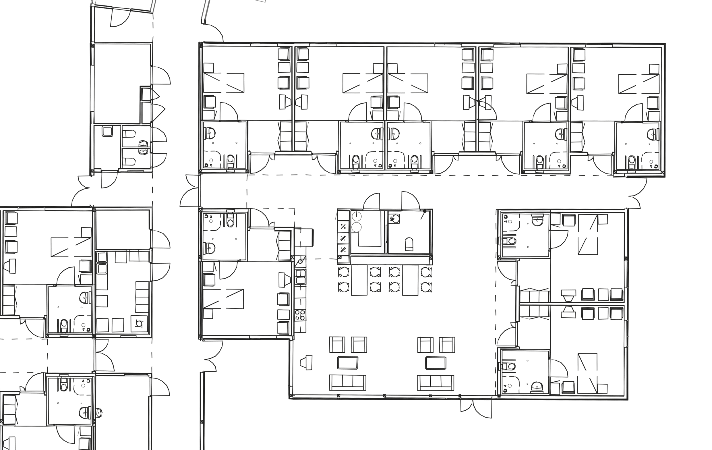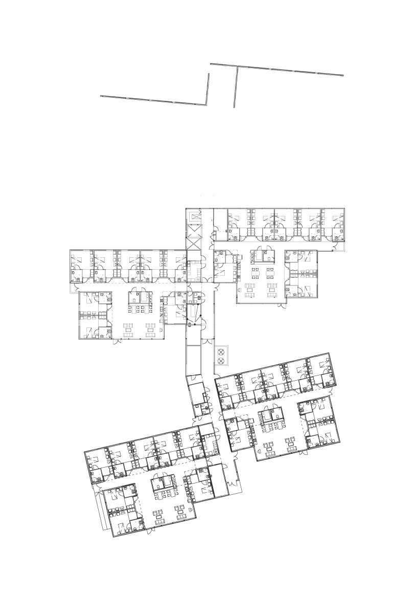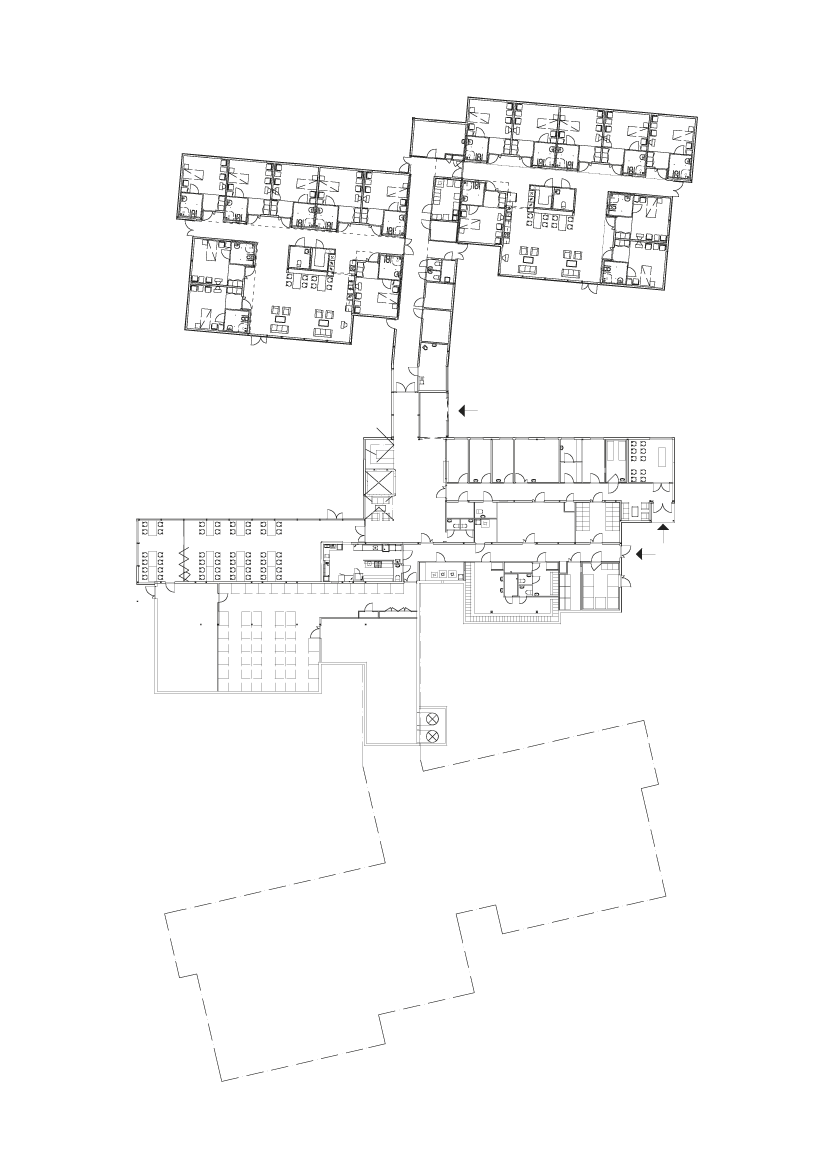 The main constituting element is the single room. Groups of eight rooms are organised around a common sitting room and kitchen, and two such groups form one ward. Two circulation systems tie the complex togeth-er: an internal network connecting the wards and the common functions, and an external network tying each ward to a common system of outdoor paths.