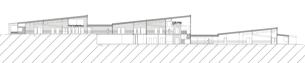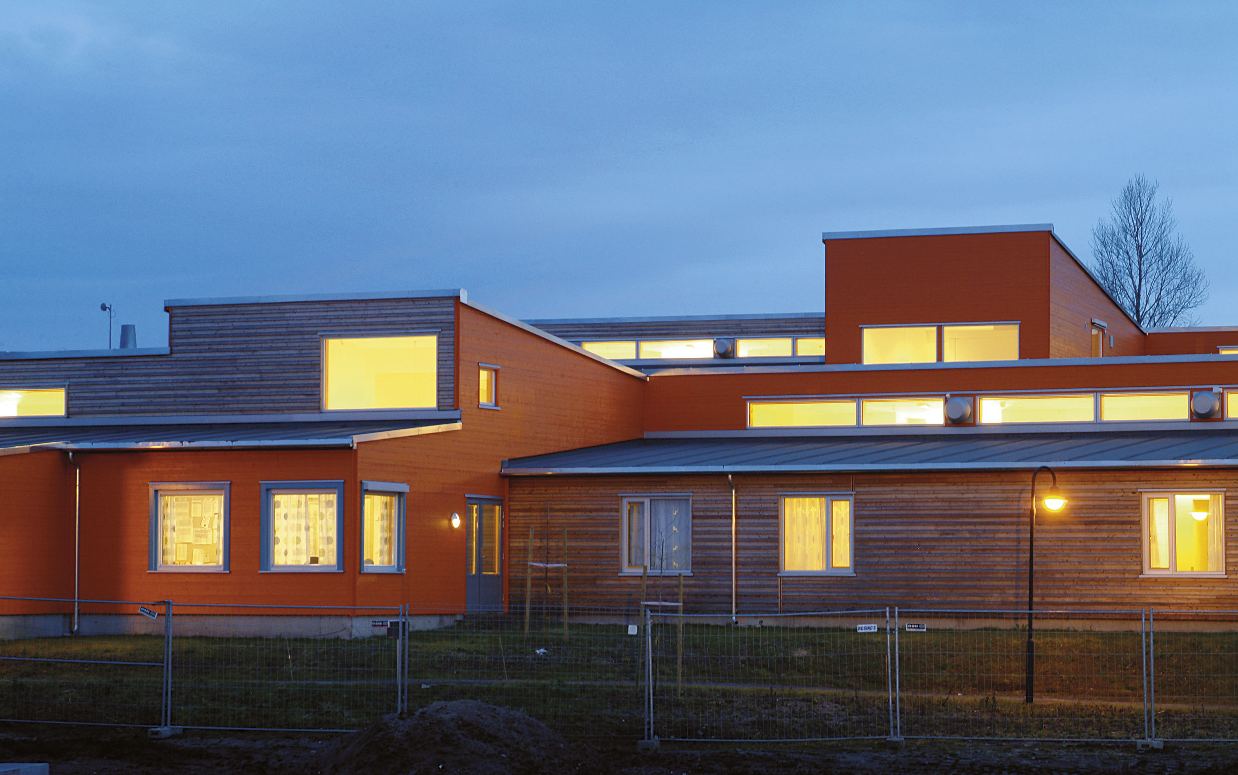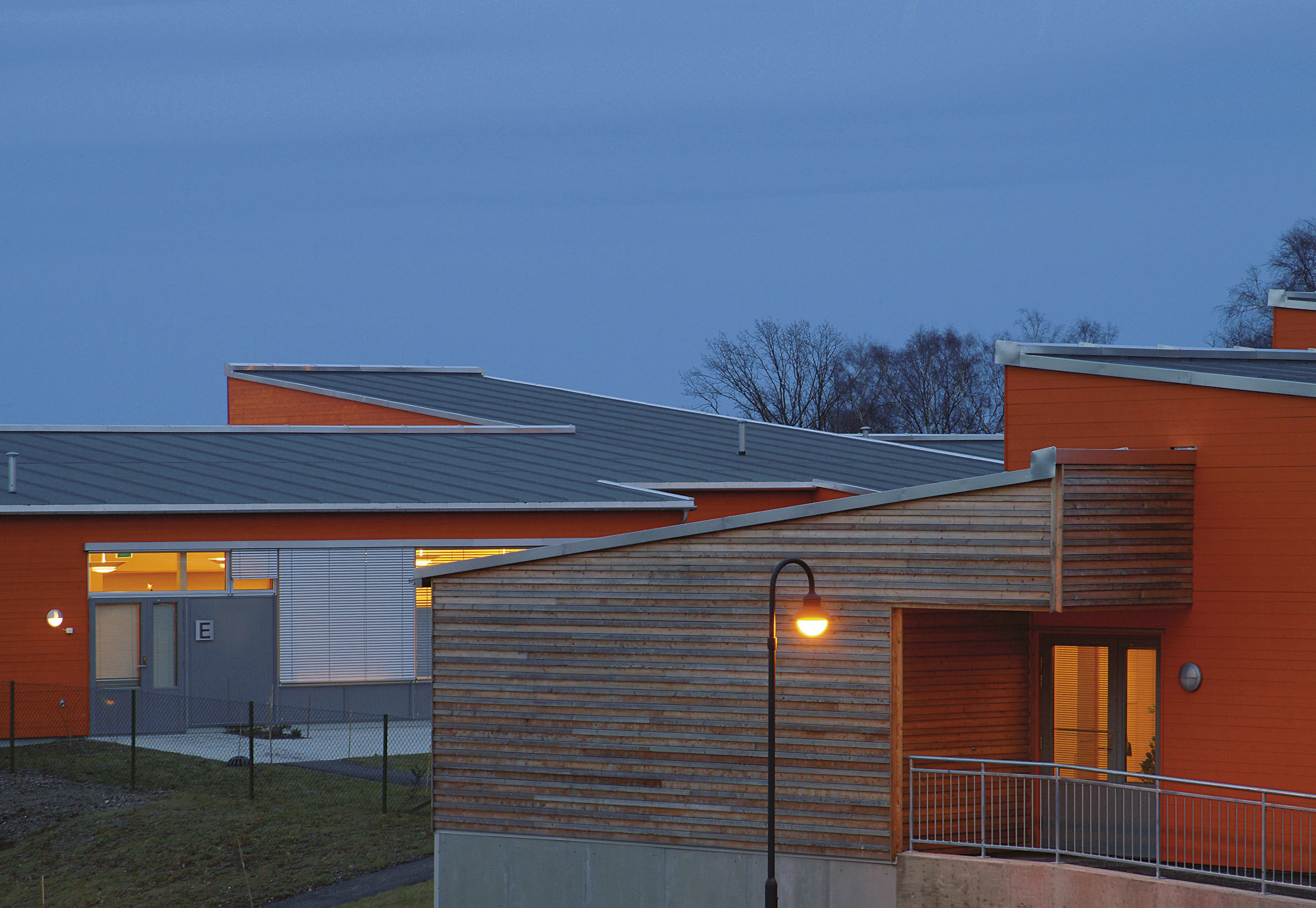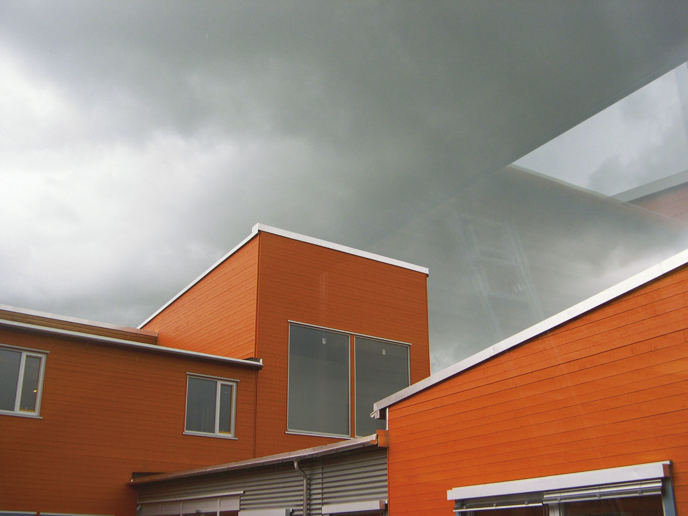 The plan allows differing degrees of openness between the different functional zones both in- and out of doors. Most areas have direct access to outdoor areas, giving a long, low complex, unified by the roofscape, which varies in pitch and direction. The windows mark each residential room. The external materials – orange painted wood, untreated larchwood and untreated aluminium – will change over time as the larch-wood turns from golden to silver grey.