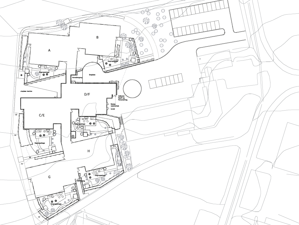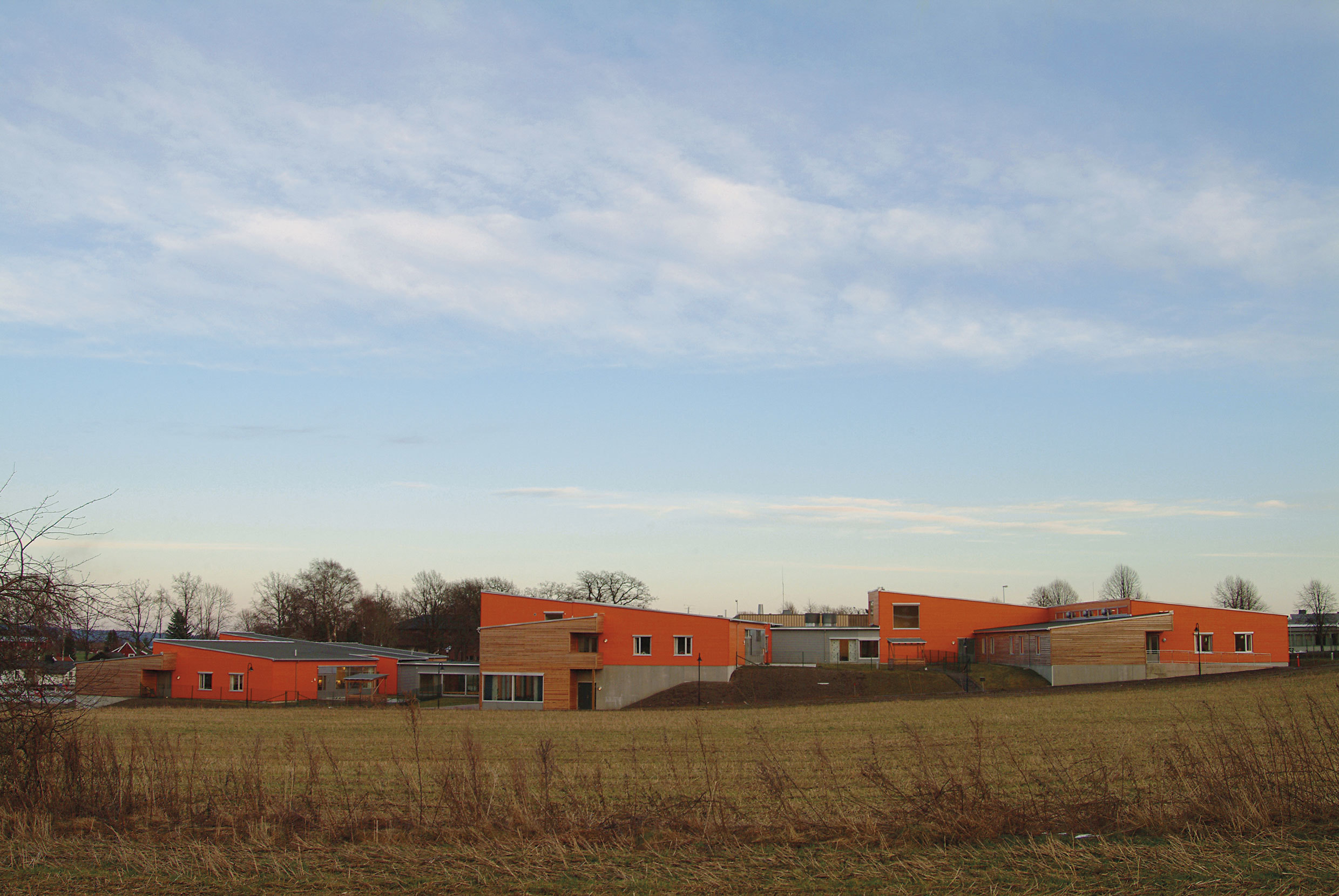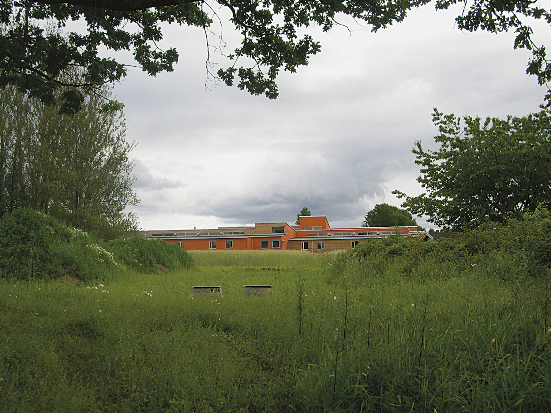 Bygget ligger i et åpent åkerlandskap, fritt fra annen bebyggelse. Ønsket om direkte utgang til uterom fra størstedelen av arealene gir et utstrakt, lavt bygg. Elementproduksjon og repeterende program gir enkle skjemaer.
