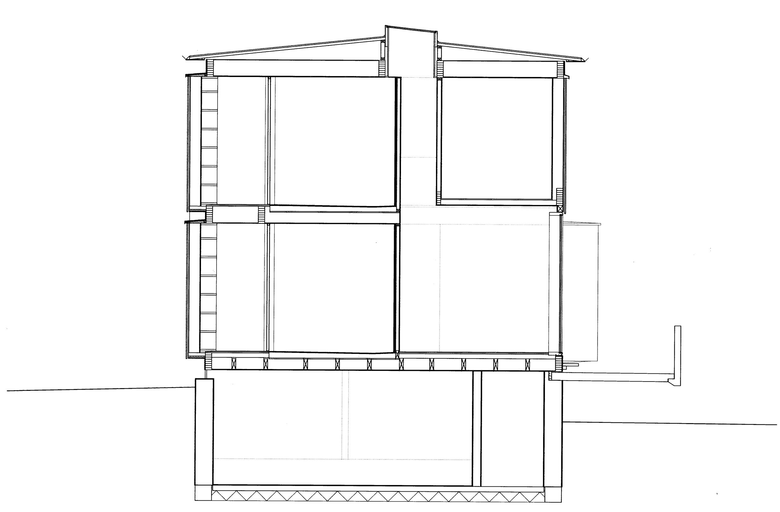 Husets konstruksjon er visuelt undertrykt for å la det romlige spillet framtre. Dekkene er rammekonstruksjoner av limtre. Disse rammene bæres av de ulike volumene, delvis med sideveis forskyvning av kreftene. Ytterveggene ble levert prefabrikkert i bærbare dimensjoner (1,2 m).