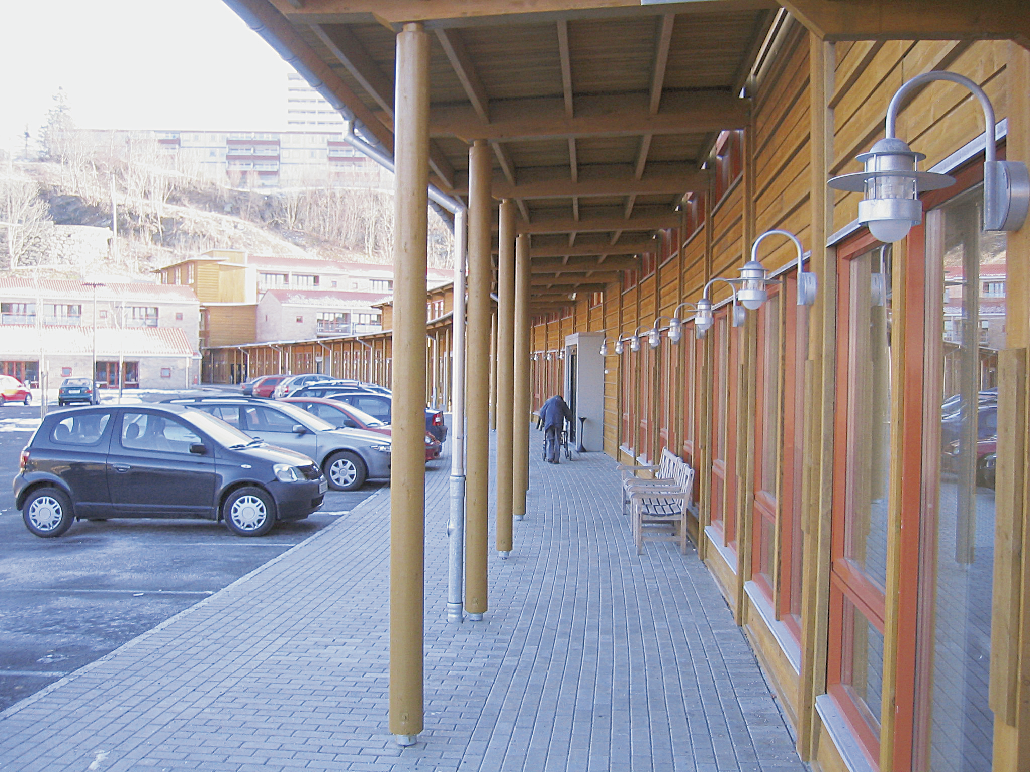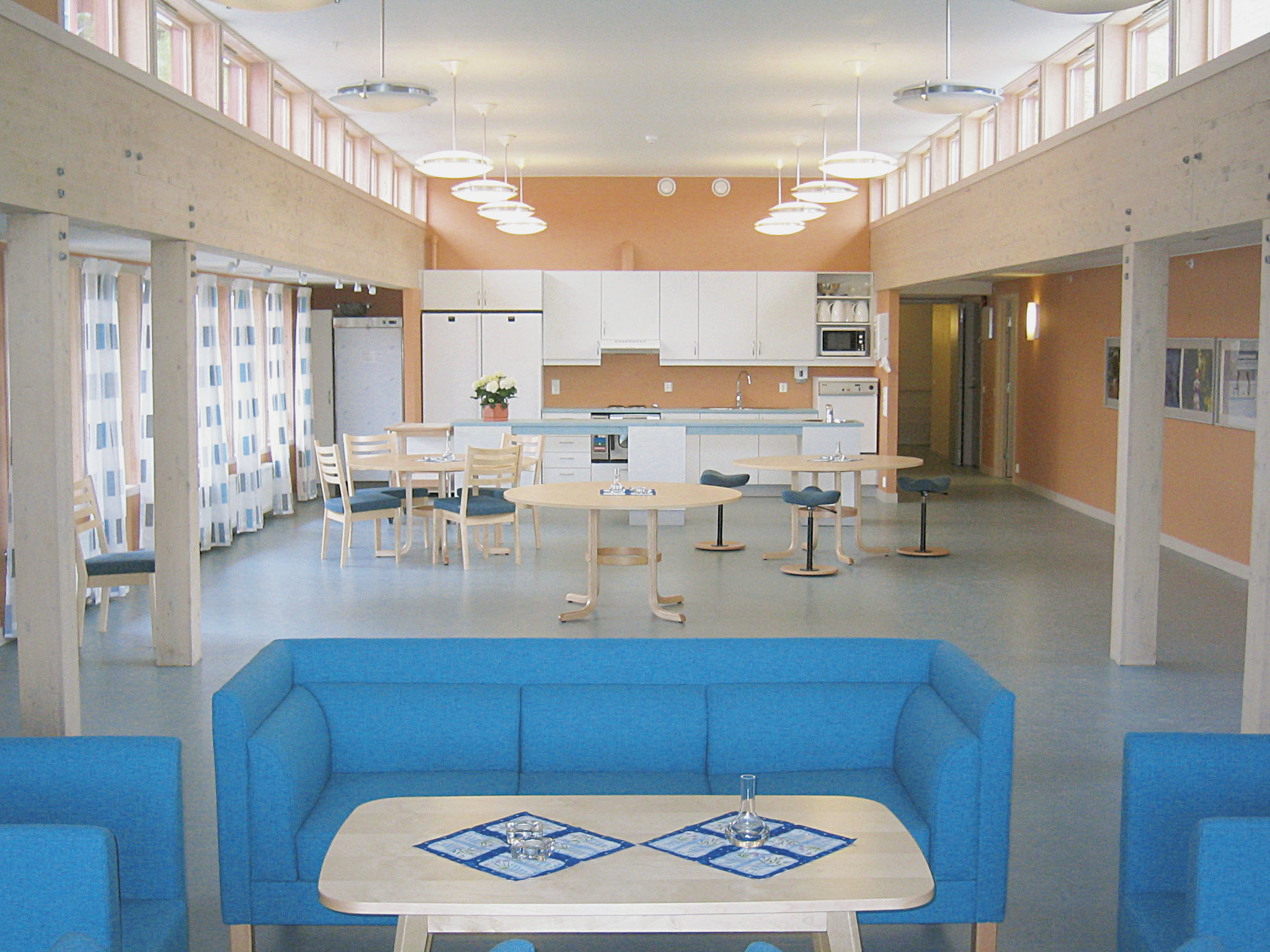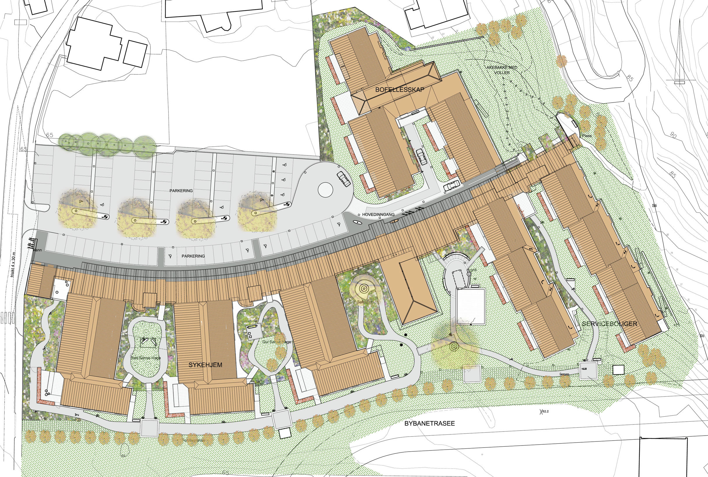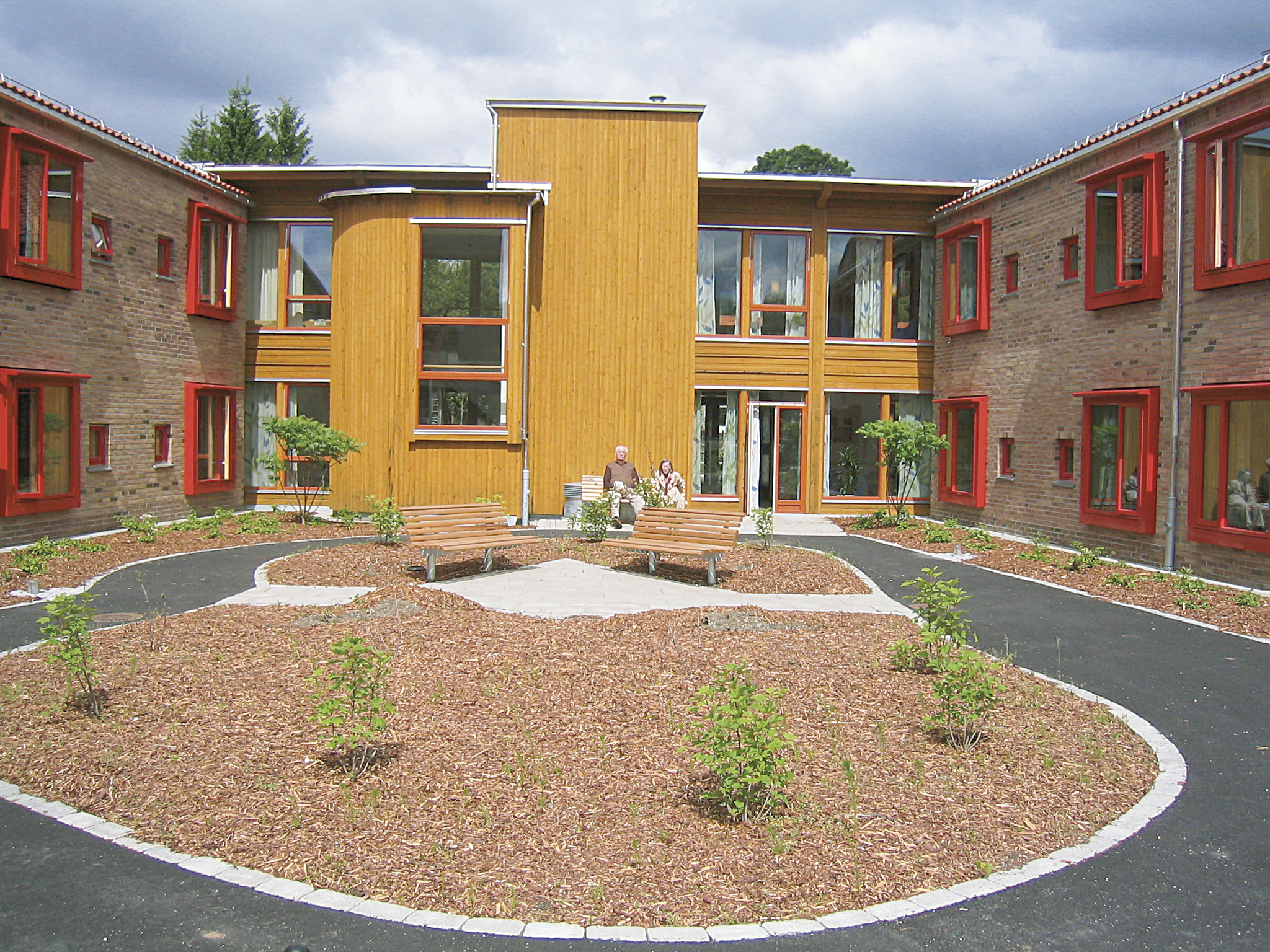 This care home is structured like a village, with single buildings along a curved common axis. Entrance is by the «village -square» and the administration. To the west lies three two-storey care wings, with six wards, each with ten rooms and a double-aspect communal space. To the east the axis passes the 48 two-room service flats and ends in the communal residence, which consists of eight units adapted for the severely disabled.