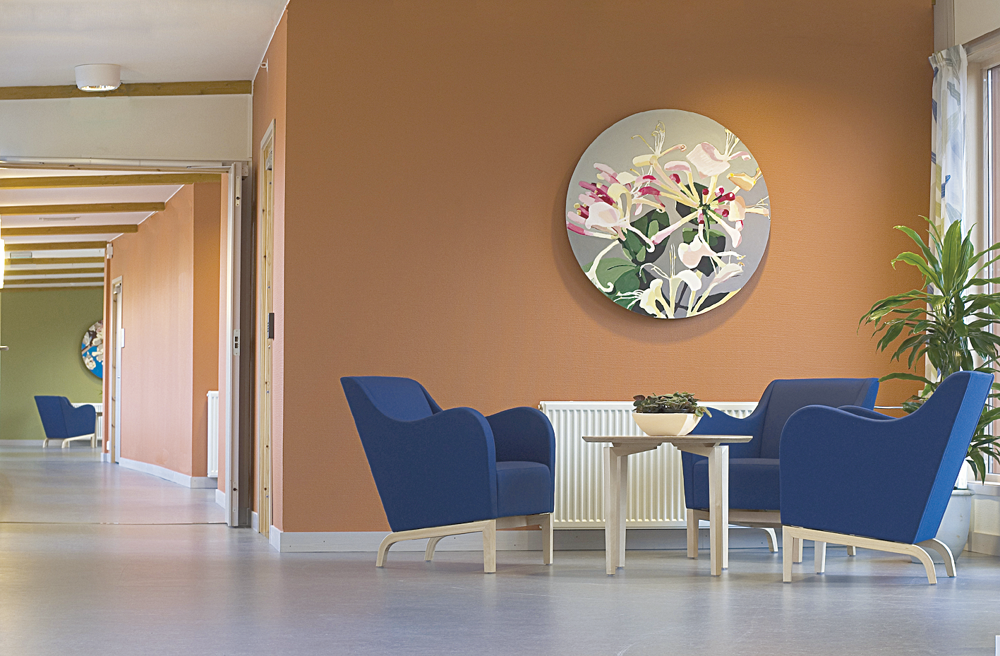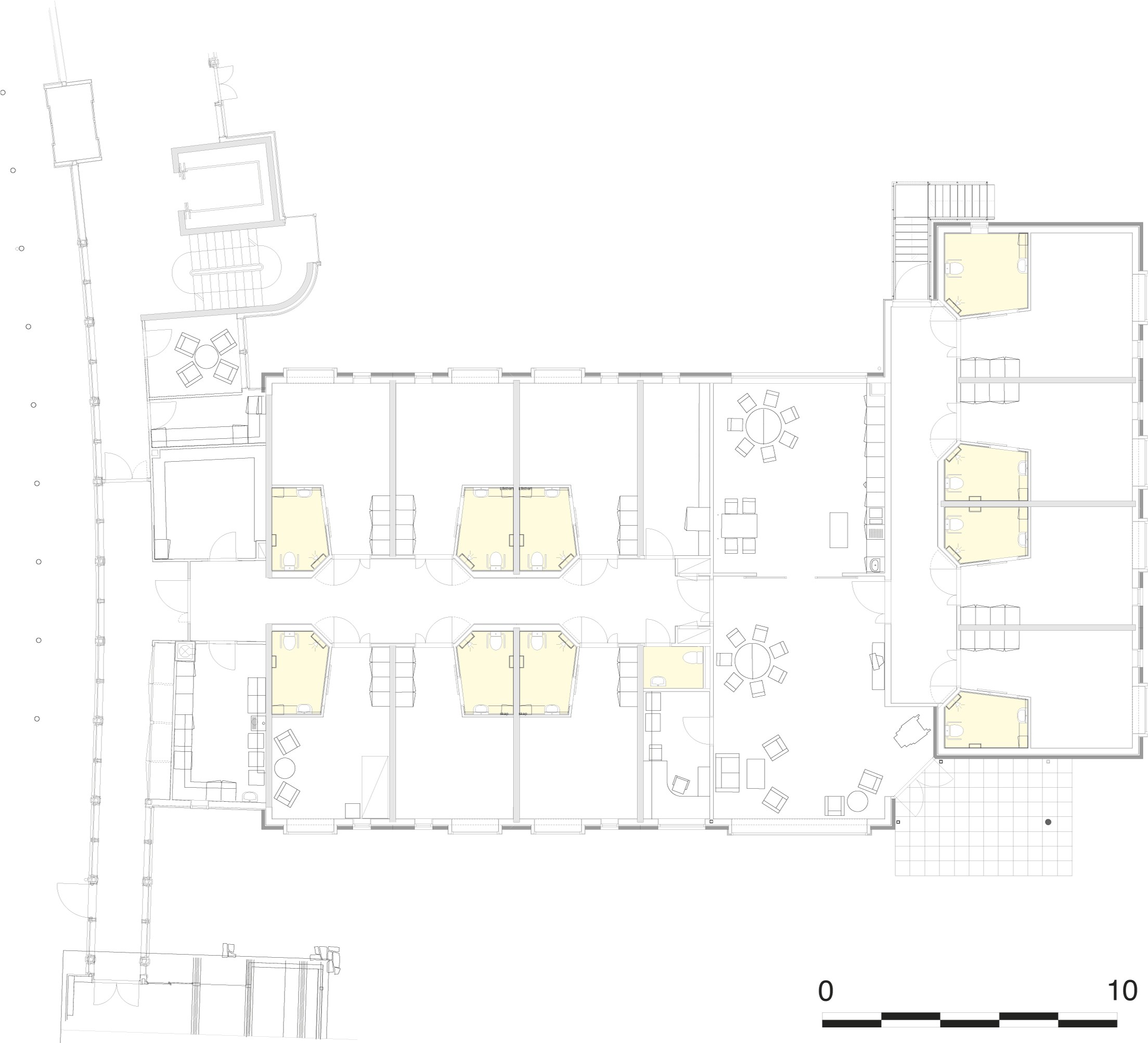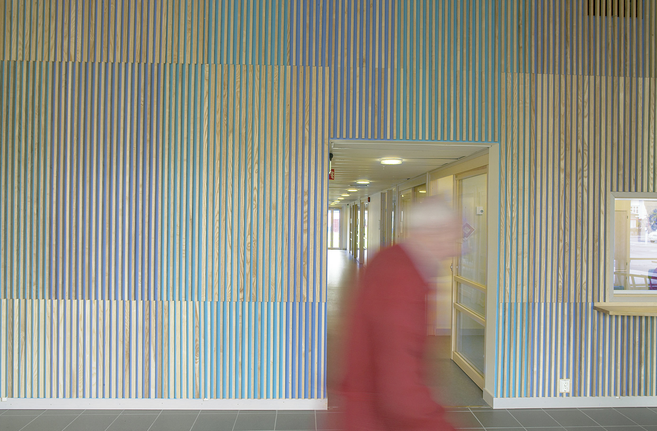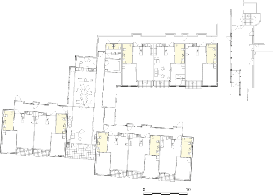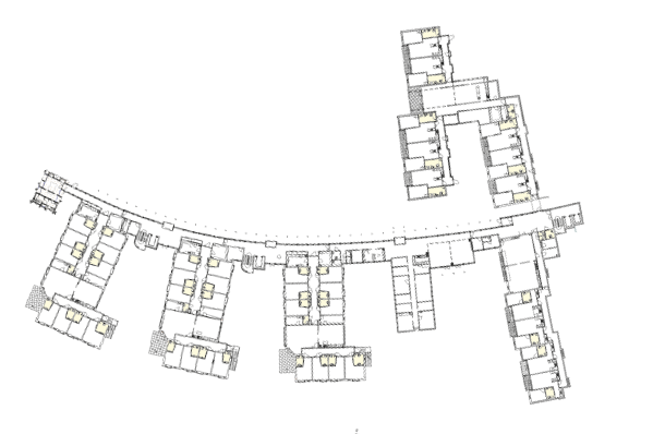This care home is structured like a village, with single buildings along a curved common axis. Entrance is by the «village -square» and the administration. To the west lies three two-storey care wings, with six wards, each with ten rooms and a double-aspect communal space. To the east the axis passes the 48 two-room service flats and ends in the communal residence, which consists of eight units adapted for the severely disabled.