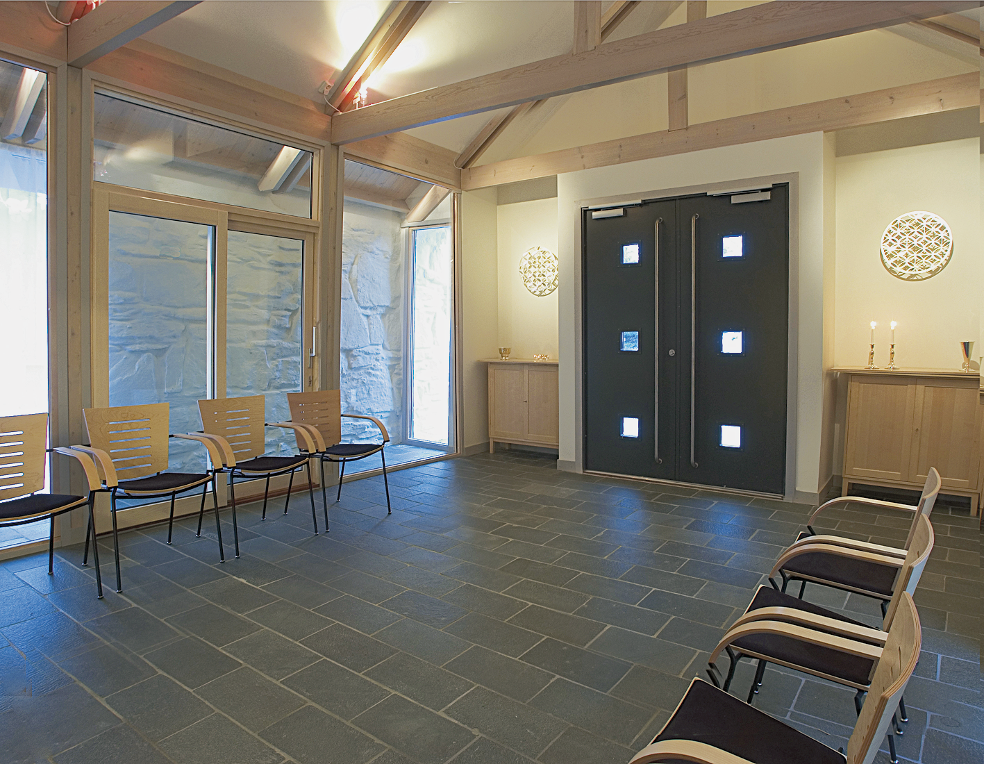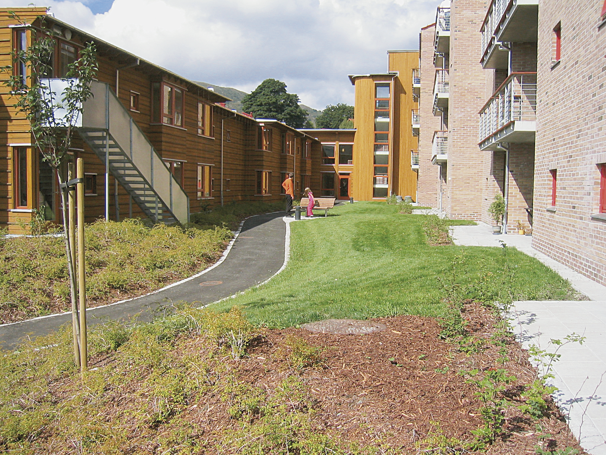 Outdoor areas face south, and their design varies to aid orientation. The communal residence has its own outdoor area with fireplace.