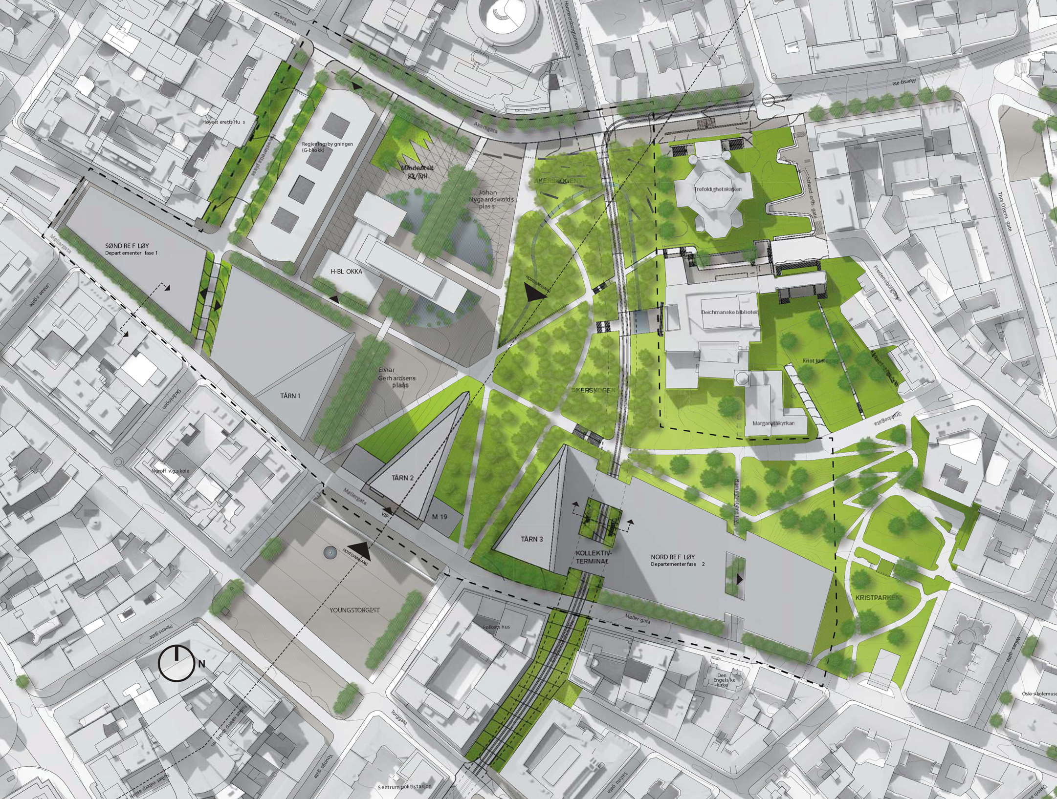 Byplangrep: Oslo 2024 – grønn mobilitet  Ved å stenge Akersgata og Møller-gata for privat biltrafikk, gjøres det en tydelig prioritering av grønn mobilitet i Oslo sentrum. Det nye trafikkhierarkiet prioriterer gående og syklende i gatebildet. Kollektivtilbudet utvides og forsterkes med nytt kollektivknutepunkt i RKV. Varelevering begrenses til definerte soner og leveringsformer, mens VIP-transport bare gjennomføres med miljøvennlige kjøretøy. De nye gang- og sykkelveiene danner et finmasket nettverk av tverrforbindelser gjennom det nye RKVs område.  RKV 2024-2064: Blå-grønne strukturer  De overordnede blå og grønne strukturene i Oslo er preget av de sammenhengende grønne dragene langs vassdragene ned til Oslofjorden. I nærområdet er dette representert ved Akerselva øst for området. Slottsparken i vest, samt St. Hanshaugen og Vår Frelsers gravlund i nord, er eksisterende viktige grønne lunger i byen. Vi ønsker å lage en byskog i sentrum som utvider det eksisterende grønne draget på Akersryggen og forbinder det med Kristparken, Kristkirkegården og Scharndorffs plass rett nord for RKV. For å skape en inviterende, raus og grønn offentlig parkstruktur, må det gis nok plass til den nye Akerskogen.  Masterplan for folk  Det er byrommene som er viktigst. Det er her folk ferdes og møtes i byen, og det er byrommene som definerer den nye Regjeringsparken. Masterplanen viser en tydelig sammenheng mellom bygg og landskap, hvor folk har prioritet på bakkeplan. De nye ikonografiske tårnene er arbeidsplasser og reflekterer demokratiet i det vertikale planet.