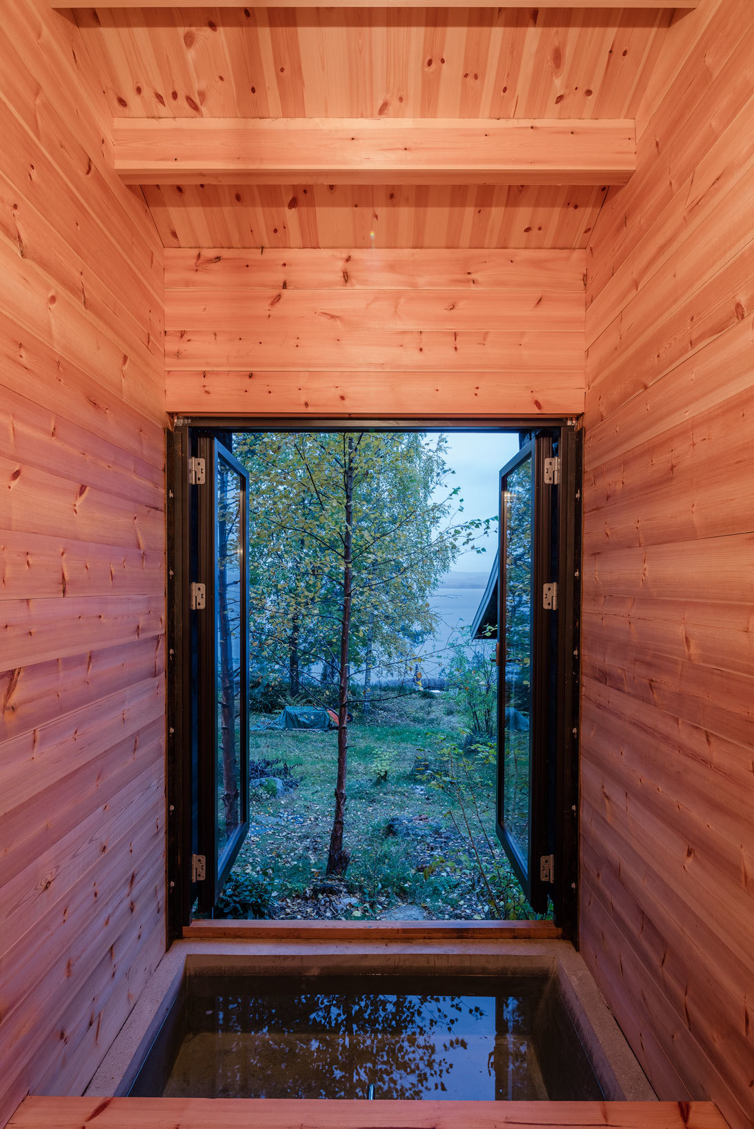 Soverommene og arbeidsrommet har samme snitt og bredde, men ulike romlengder. Soverommet er én sengelengde langt, mens gjesterommet kan ha to senger i lengden. Lafteveggene fortsetter utenfor lafteknuten i bygningens lengderetning og gir rom for et overdekket utekjøkken og lagring. Mellom lafteknutene i bakkant av soveromsfløyen er det etablert et installasjonssjikt til badet, som er et eget volum med vegger av 3 mm brettet corténstål med en glassplate som tak.