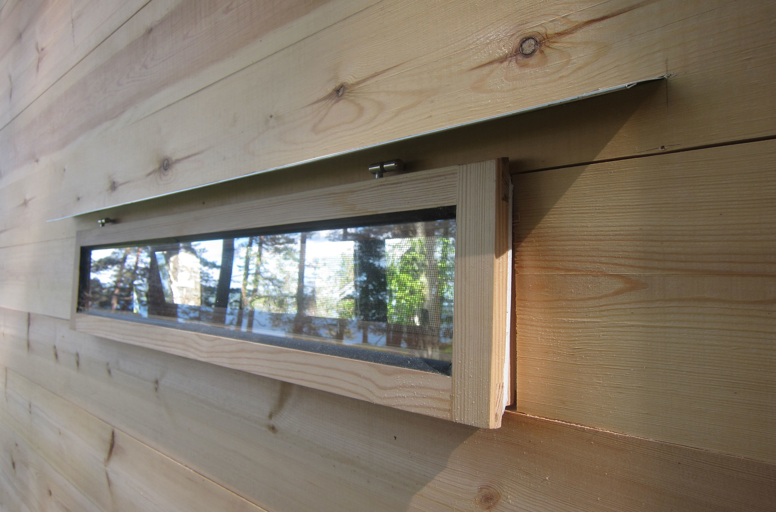 Den doble balkongdøra på badekaret og den store foldedøra står utenfor laftekonstruksjonen, som dermed får synke uavhengig. Spesialbeslag i råstål holder lafteveggen sammen og gir innfesting for glassdørene sideveis. Inngangsdørene er tegnet med spesialkarmer som er tilpasset veggens tykkelse og bevegelse, og som utgjør utvendig belistning. Luftevinduene er montert direkte i hull i lafteveggen – det framstår som om et parti av laftestokken er kuttet bort. Vindusrammene, utvendig ramme med glass og innvendig ramme med fluenetting, er hengslet i overkant av åpningen og har en enkel lukkemekanisme på innsiden.