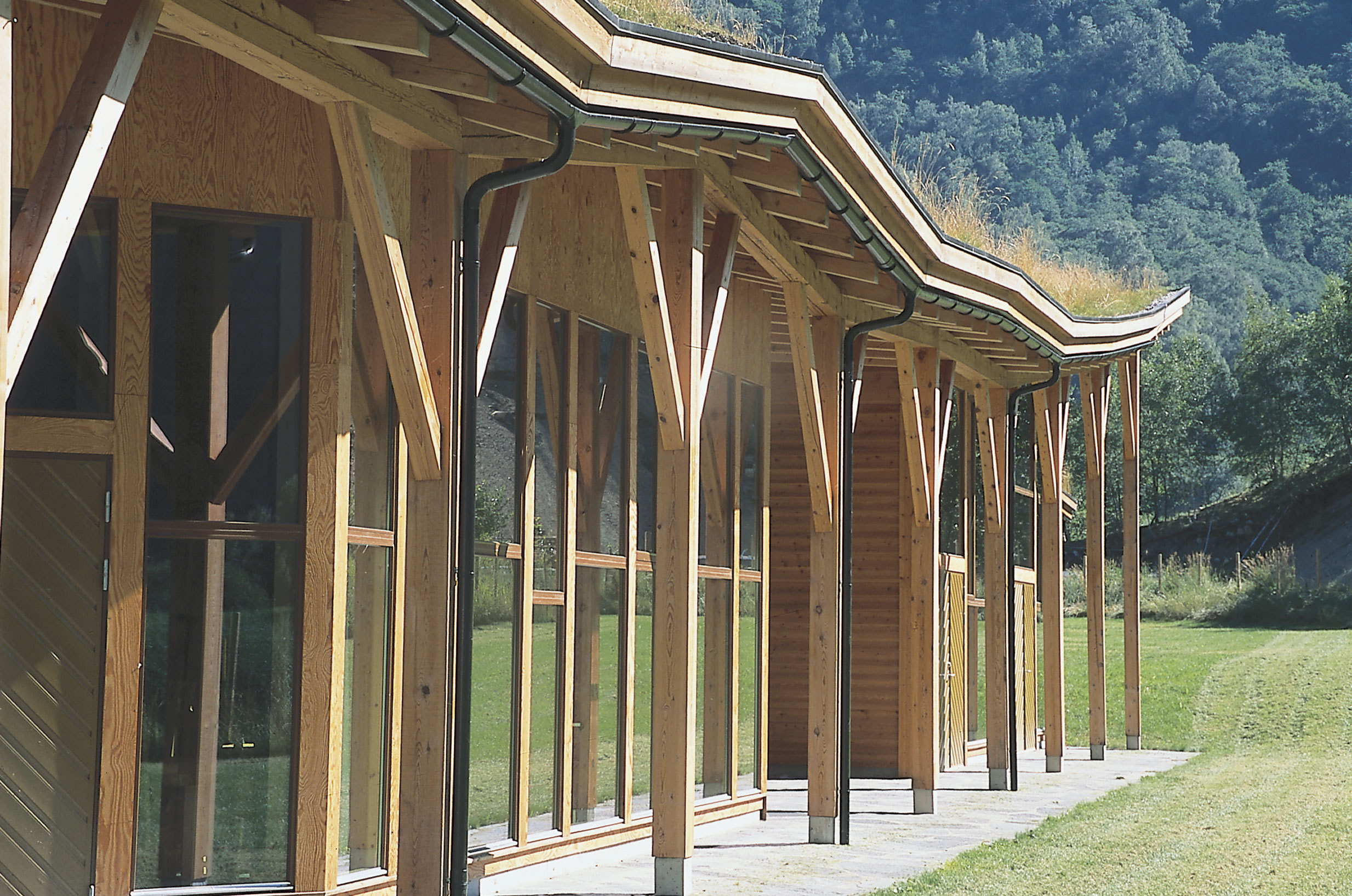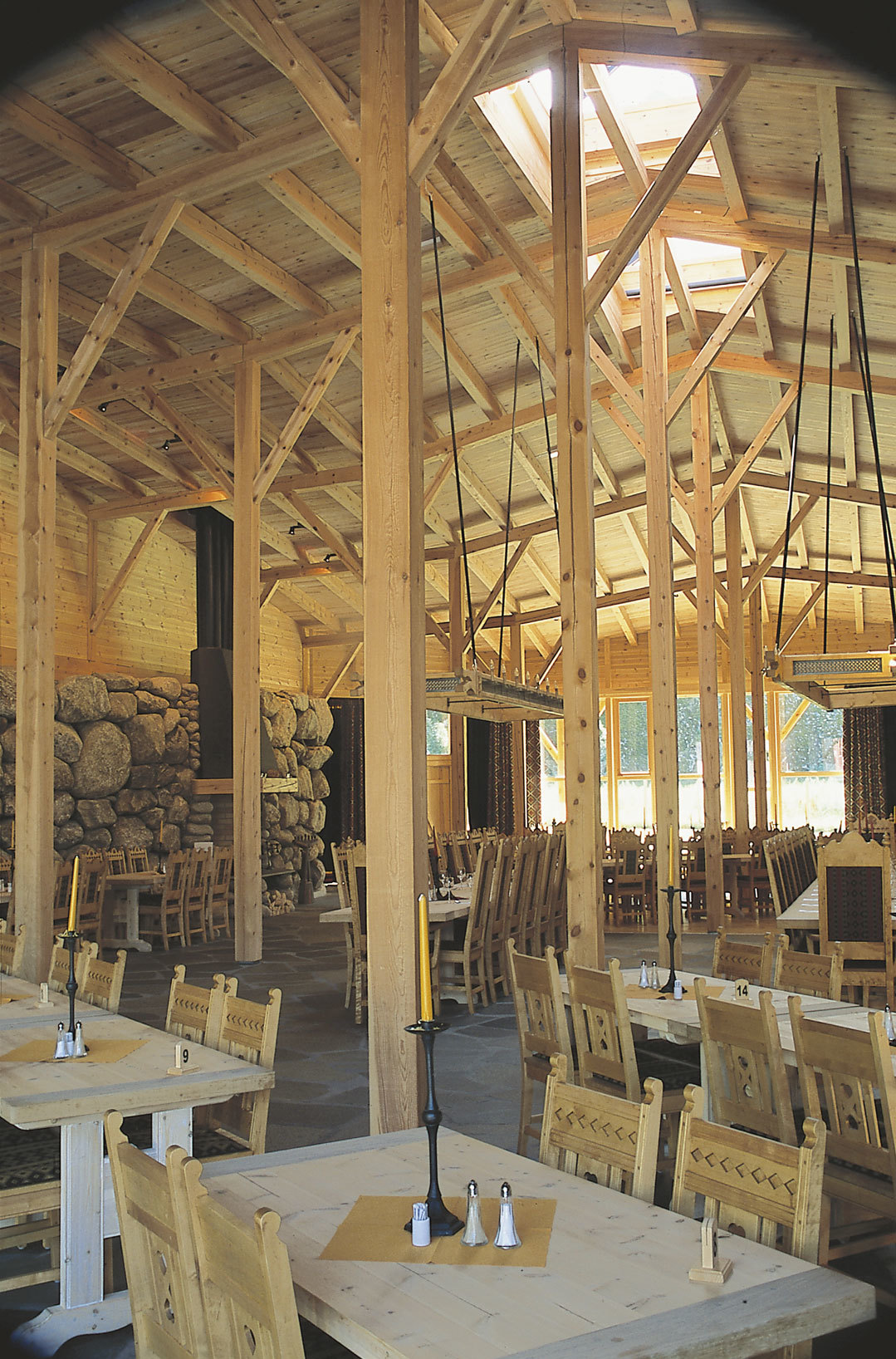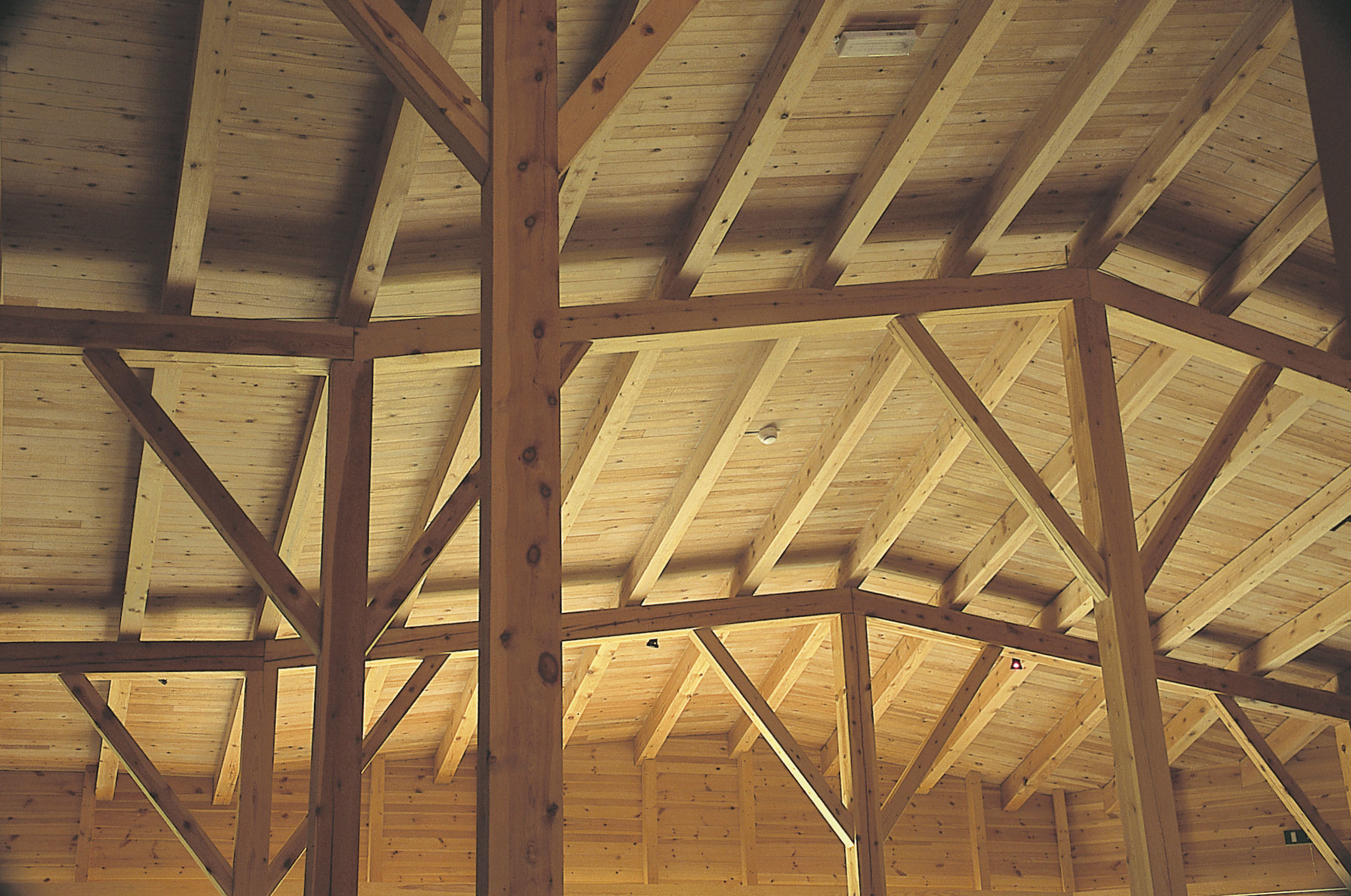 Trekonstruksjonene – søyler, dragere, skråstag, sperr og sutak av heltre – er samlet blitt en stor treskulptur på 1 527 kvm. Bruk av heltre (ikke laminert) fremtvinger en mindre skala med en søylemodul på 3,5 x 4,0 m, som har gitt den store hallen intime steder.