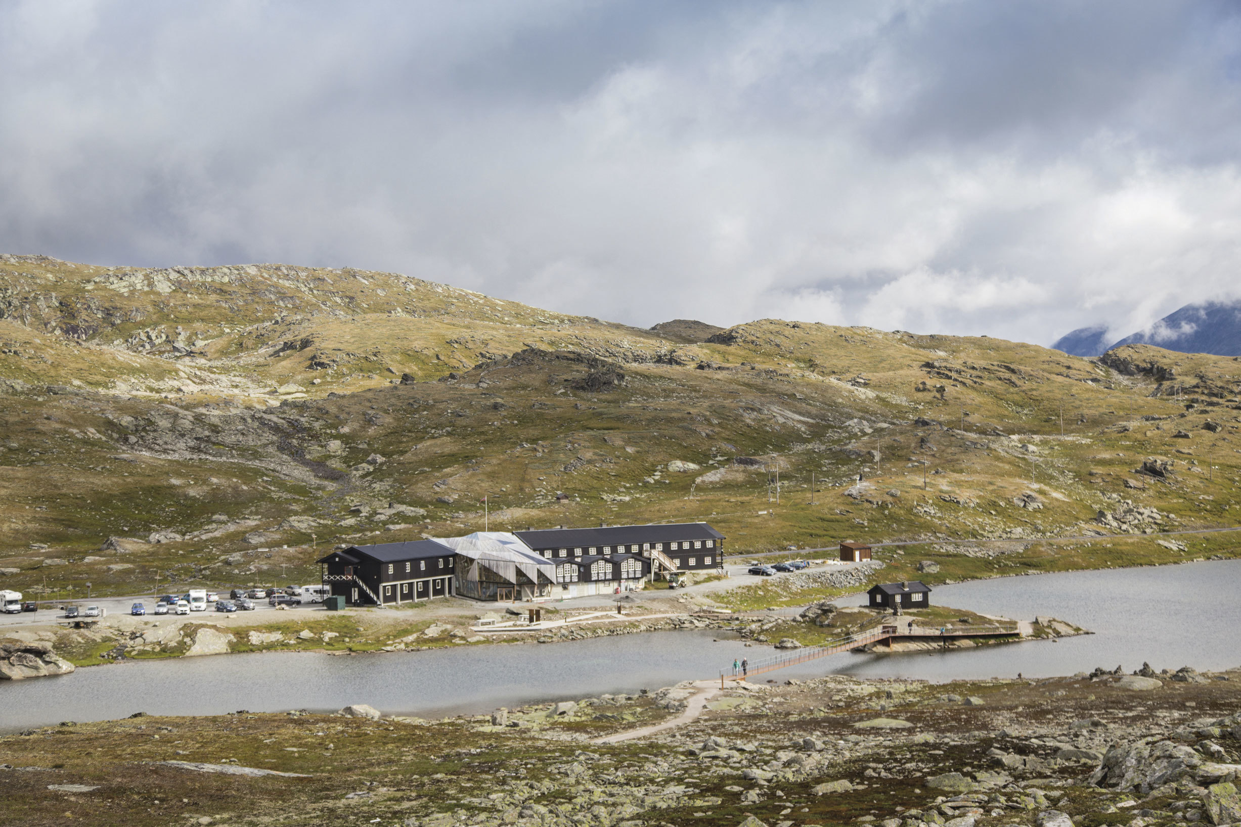 Nå er vi midt på Sognefjellet, på det høyeste punktet du kan komme med bil, Sognefjellshytta, 1434 meter over havet. Dette er en av Den Norske Turistforenings betjente hytter og består av to originalbygg (1947), og et nytt tilbygg (tegnet av Jensen og Skodvin i 2015) i tre og glass som binder de to eldre byggene sammen. Vi har gått inn på grusunderlaget i det store og åpne rommet i sistnevnte bygg og speider ut over anlegget til Innfallsporten som er Sognefjellhyttas siste oppgradering.