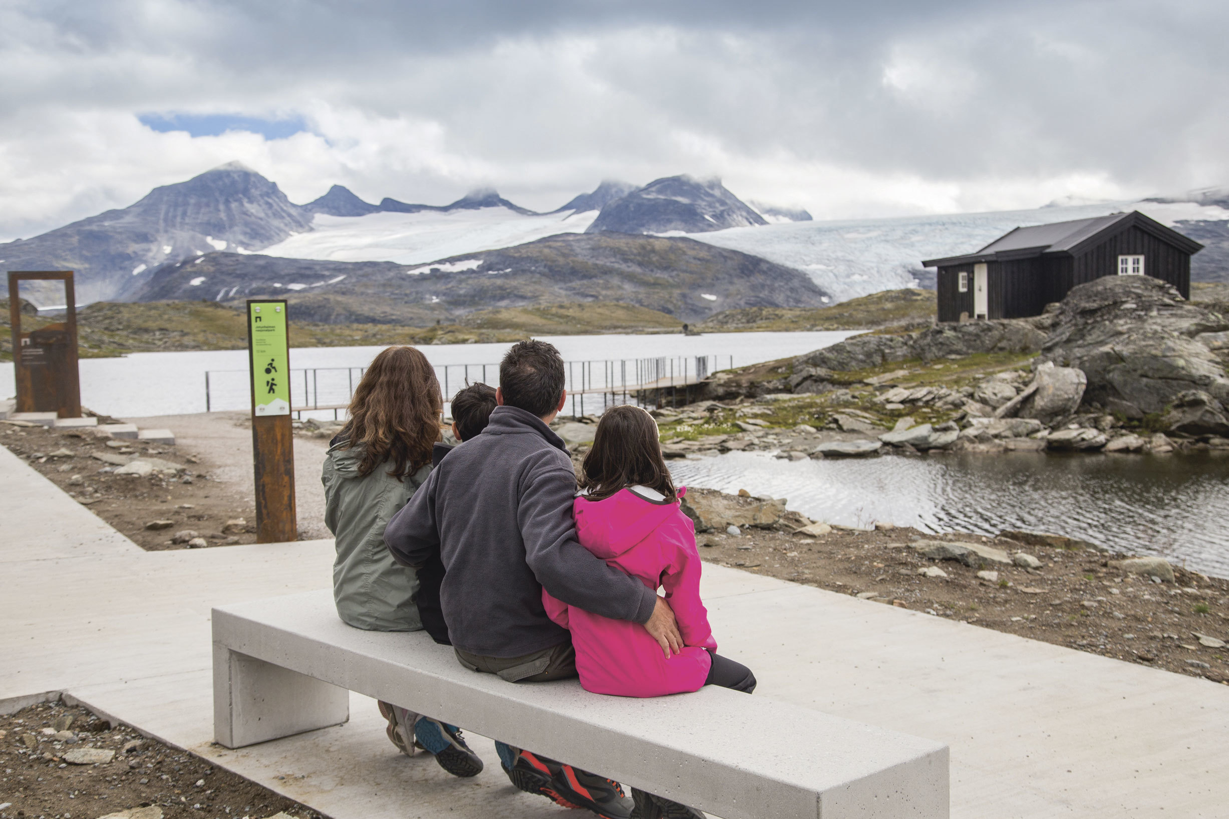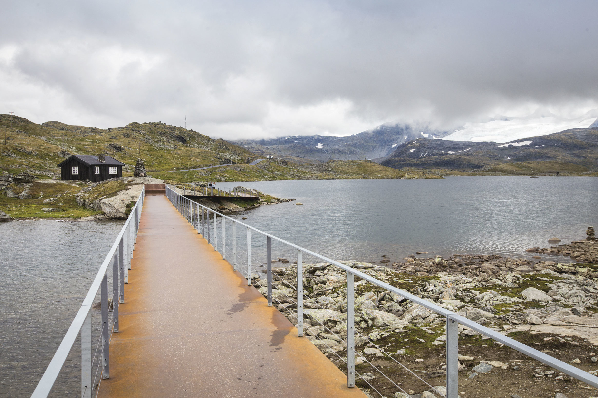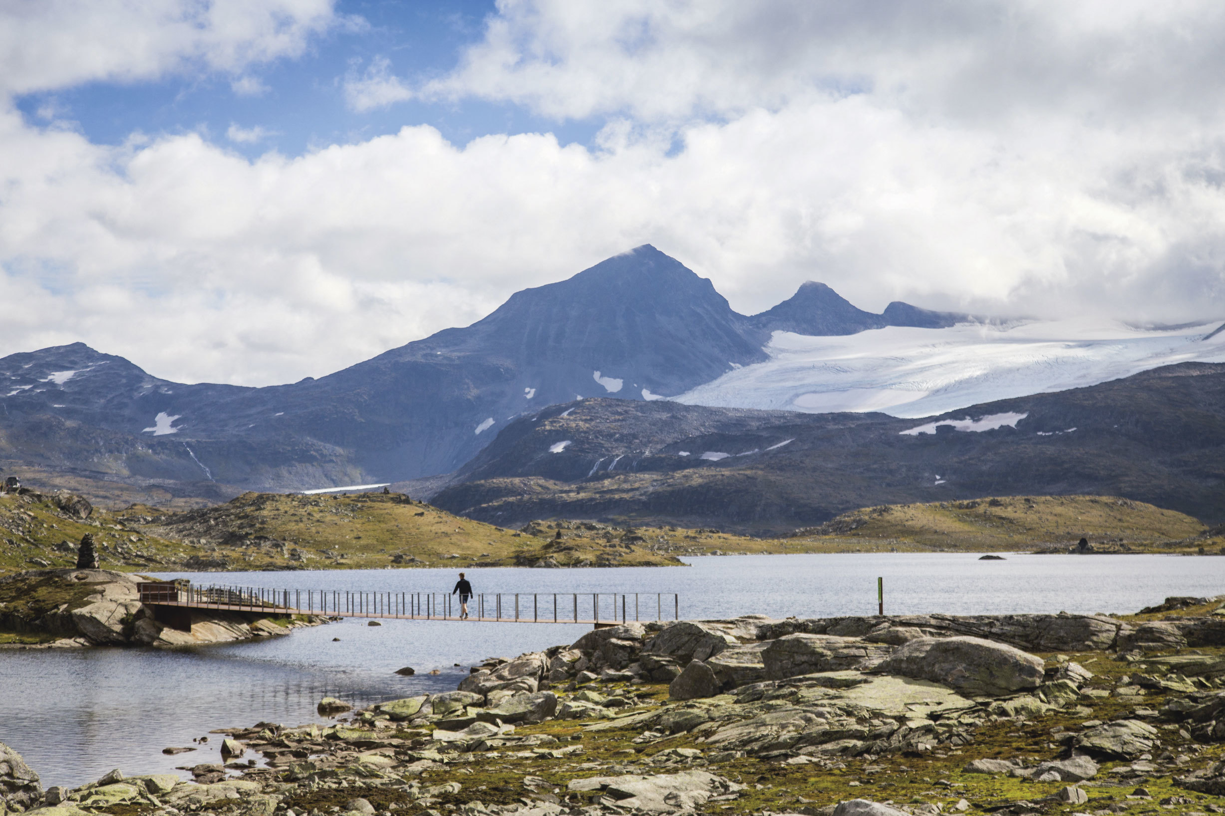Som mange andre gjester på Sognefjellshytta, starter vi oppholdet vårt med å gå den nye, tilrettelagte runden. Vi går ned en betongrampe, som når den står ferdig, også vil fungere som en rasteplass med informasjonsskilt, og videre over den første broa. Underlaget er fast, og stålet under føttene gir fra seg overraskende lite lyd. Broa er montert på enkle stolper, som bryter vannflaten og går ned i vannet. Videre fortsetter vi over et kort parti med grus, som knaser når man går, før en ny stålbro kommer til syne rundt svingen. Dette er en hengebro med et spenn på 52 meter, og det gynger lett når man går over den. Det klinger litt i den 2 centimeter tynne stålplata som utgjør gulvet. Vi ser flere barn og voksne som hopper ute på broa før de går videre. I den ene enden, nærmest Sognefjellshytta, er broa «brettet opp» så det blir en benk og fra denne er det flott utsyn mot Fanaråken. Broene i prosjektet har likt formspråk, men ulik utforming – noe som gir rom for ulike opplevelser. Etter broene fortsetter grusstien, på ca. 1,2 m bredde, rundt vannet, langs bilveien, før stien avsluttes ved Sognefjellshytta.