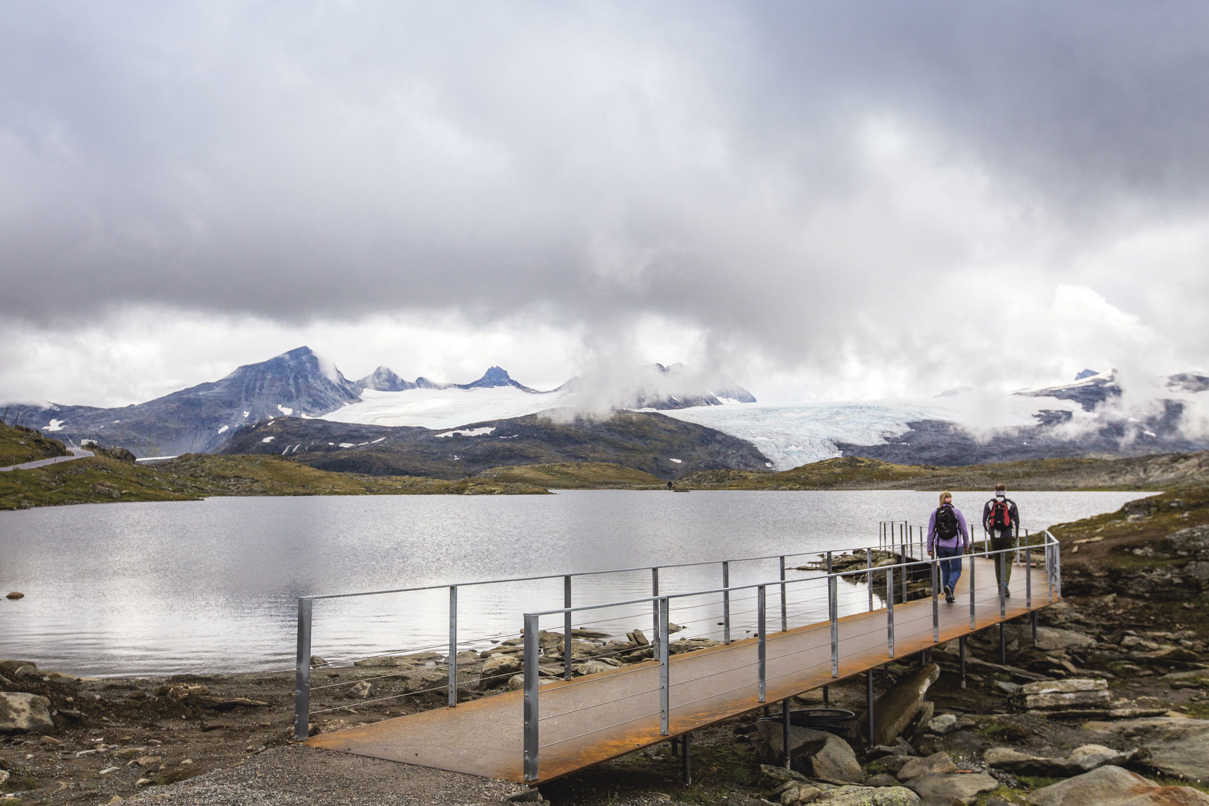 To mennesker kommer vaggende mot oss i duskregnet over stålbroa. De er kledd i skinnbukser og -jakker og har hver sin store hjelm på hodet, fortsatt med visiret nede for ikke å få regn i ansiktet. De hilser, en gest som nærmest er en fjellvettregel, når de går forbi oss. En fjelltur er ikke lenger bare en aktivitet for fjellfolk.