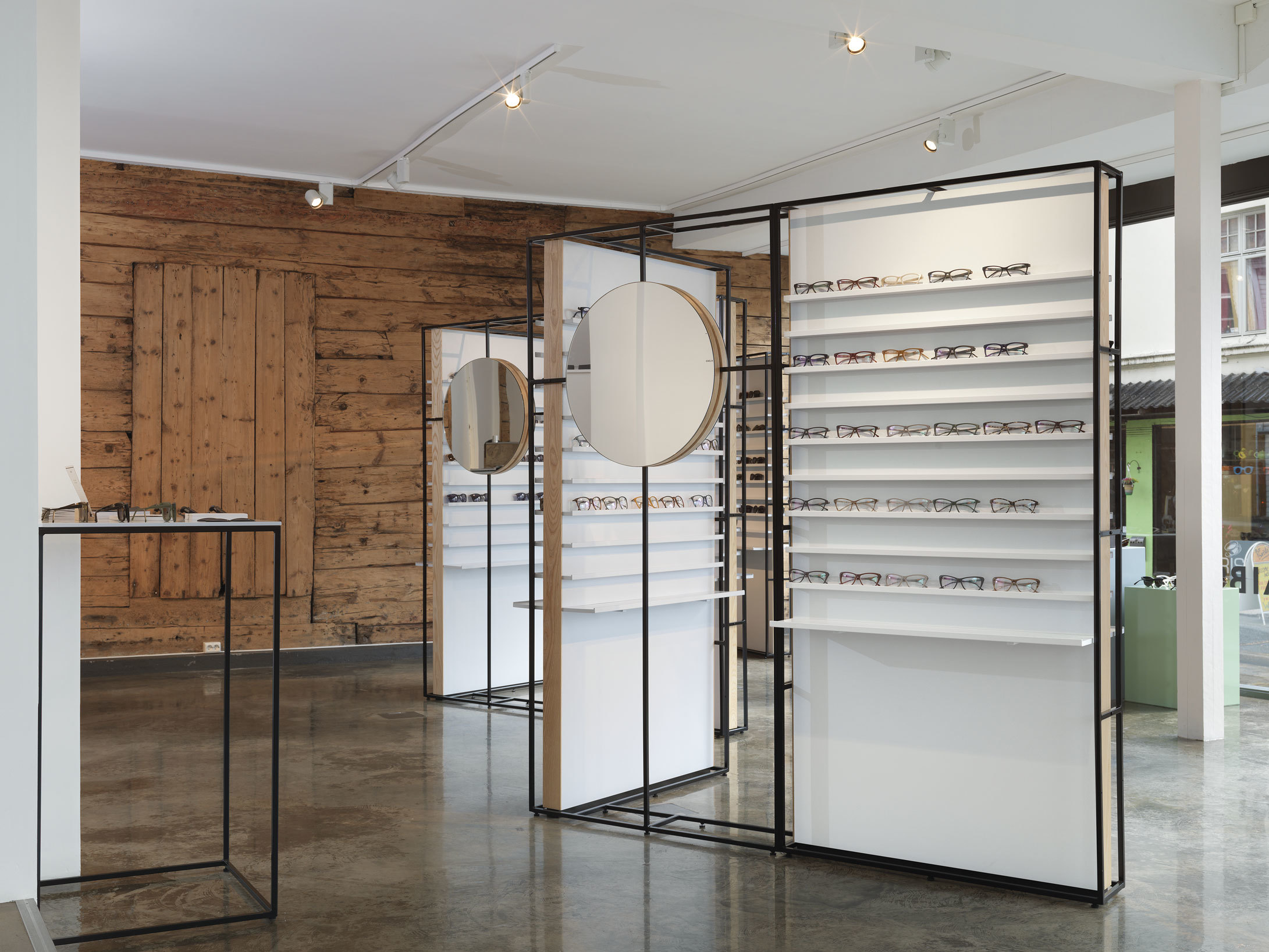 The displays are rectangular frames made of square steel bars with different inserts. The glasses are on shelves rather than on hooks. The aesthetic is aimed at matching the brand, but avoiding the sense of exclusivity.