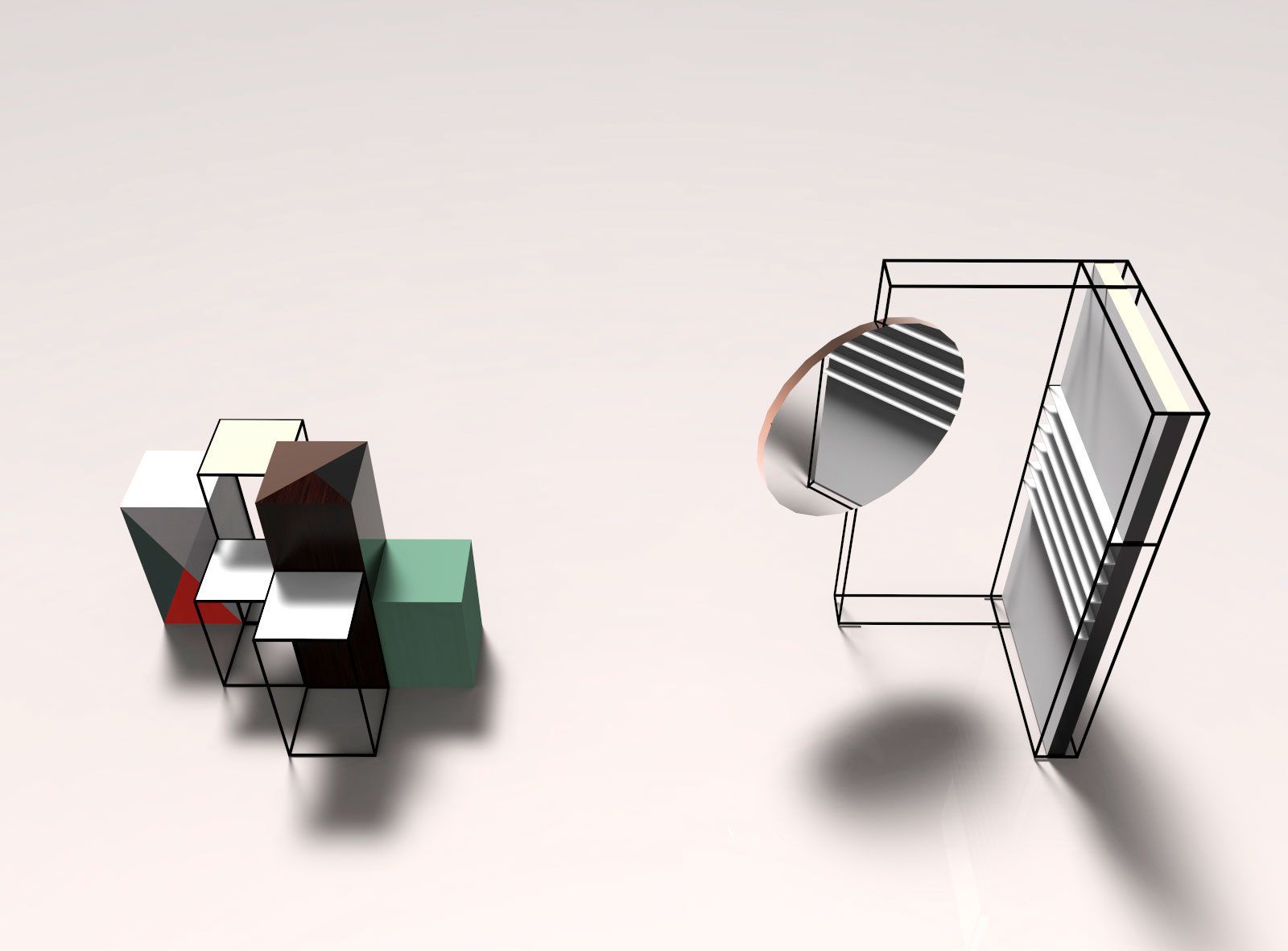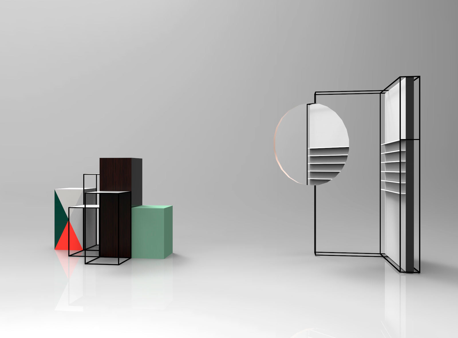 Displayene suppleres med smale bord og tette bokser i ulike høyder, satt sammen av ulike materialer og overflater. Dette er med på å skape dynamikk i innredningen, og kan brukes for å framheve enkeltprodukter og nyheter.
