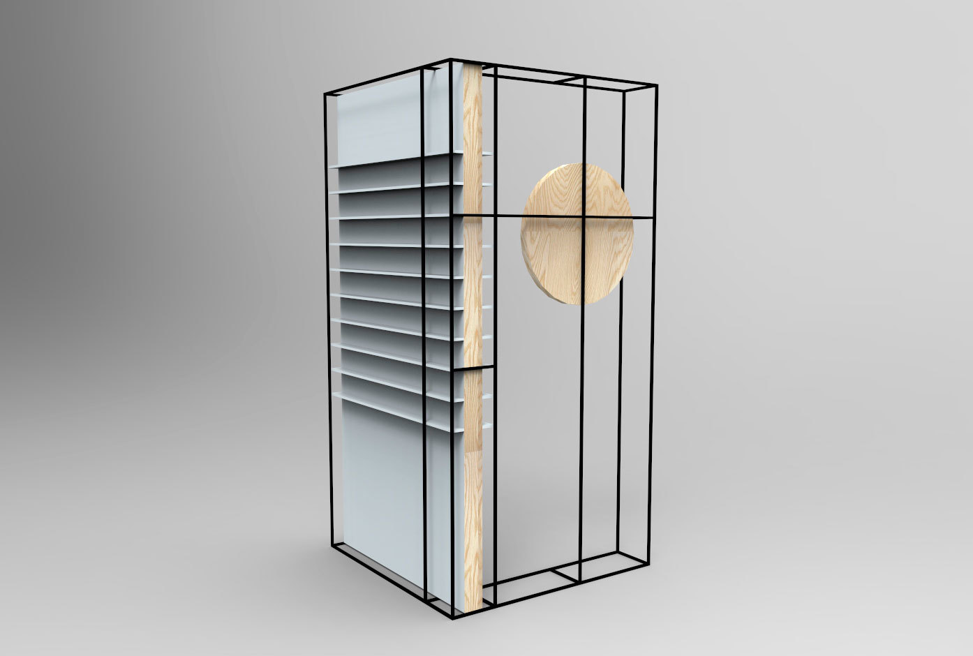 Displayene er i hovedsak rektangulære rammer av firkantstål med ulike innsatser. Bruken av firkantstål gir et sterkt grafisk utrykk, samtidig som det fremstår som nøytralt nok til at produktene kommer i fokus. Brillene legges sammenslått på smale hyller, som gjør det lettere for kunden å legge brillene tilbake på plass, samtidig som det gir et mer uformelt uttrykk. Vi har valgt lys ask på kantene og en tilnærmet hvit farge med et hint av blått på selve displayene.