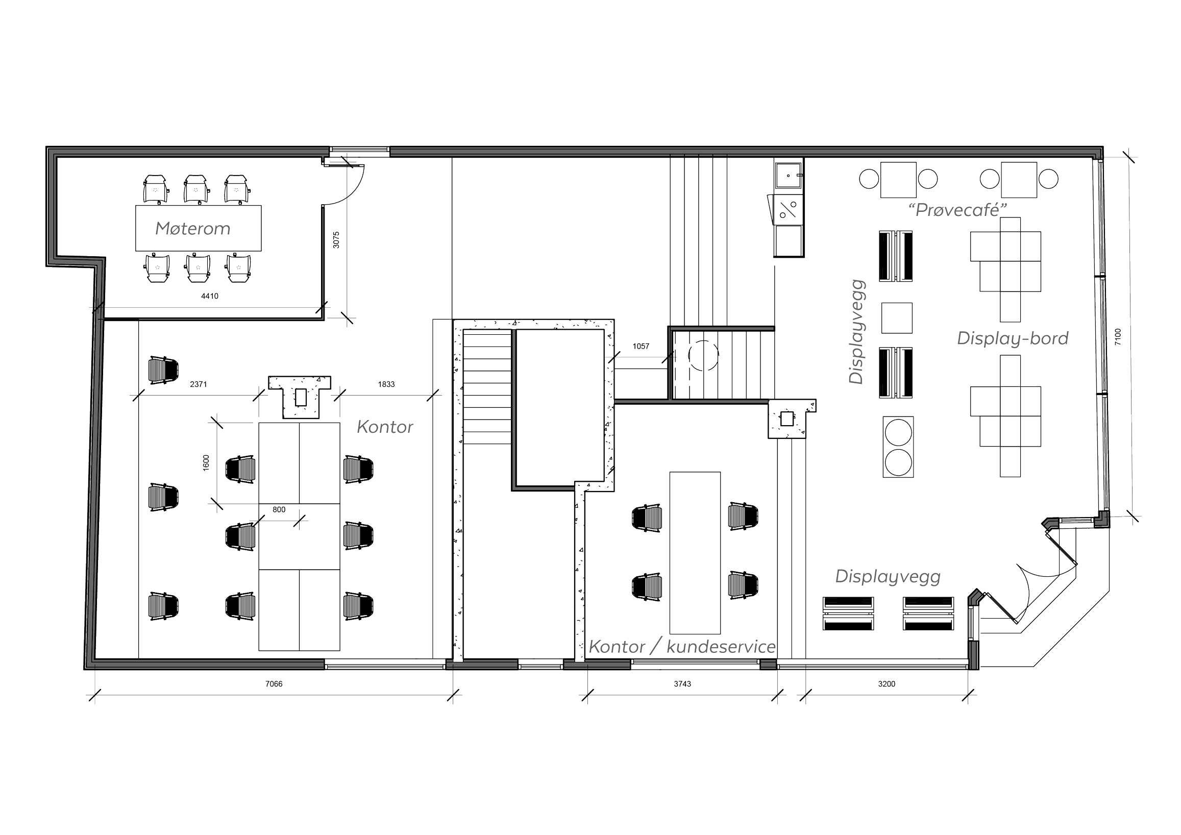 I butikken i Bergen har vi videreført estetikken i displayene til en baristadisk, et stort møtebord og benker. Selve lokalet er relativt nøytralt og ukomplisert. Noen av de gamle tømmerveggene er framhevet som en fin kontrast til de ellers strenge linjene i innredningen. Det er valgt et enkelt betonggulv som er epoxybehandlet. Innerst i lokalet har personalet kontorer og møterom, og i kjelleren er det designavdeling og lager. Kombinasjonen av butikk og kontor gjør at personalet er mer fleksibelt og at eierne selv kan bidra i butikken på hektiske dager.
