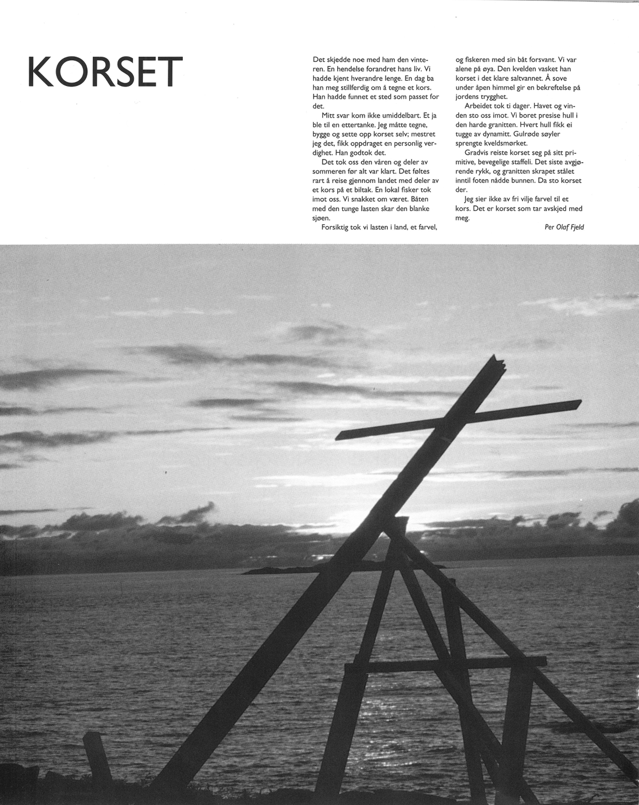 Det skjedde noe med ham den vinteren. En hendelse forandret hans liv. Vi hadde kjent hverandre lenge. En dag ba han meg stillferdig om å tegne et kors. Han hadde funnet et sted som passet for det. Mitt svar kom ikke umiddelbart. Et ja ble til en ettertanke. Jeg måtte tegne, bygge og sette opp korset selv; mestret jeg det, fikk oppdraget en personlig verdighet. Han godtok det. Det tok oss den våren og deler av sommeren før alt var klart. Det føltes rart å reise gjennom landet med deler av et kors på et biltak. En lokal fisker tok imot oss. Vi snakket om været. Båten med den tunge lasten skar den blanke sjøen. Forsiktig tok vi lasten i land, et farvel, og fiskeren med sin båt forsvant. Vi var alene på øya. Den kvelden vasket han korset i det klare saltvannet. Å sove under åpen himmel gir en bekreftelse på jordens trygghet.