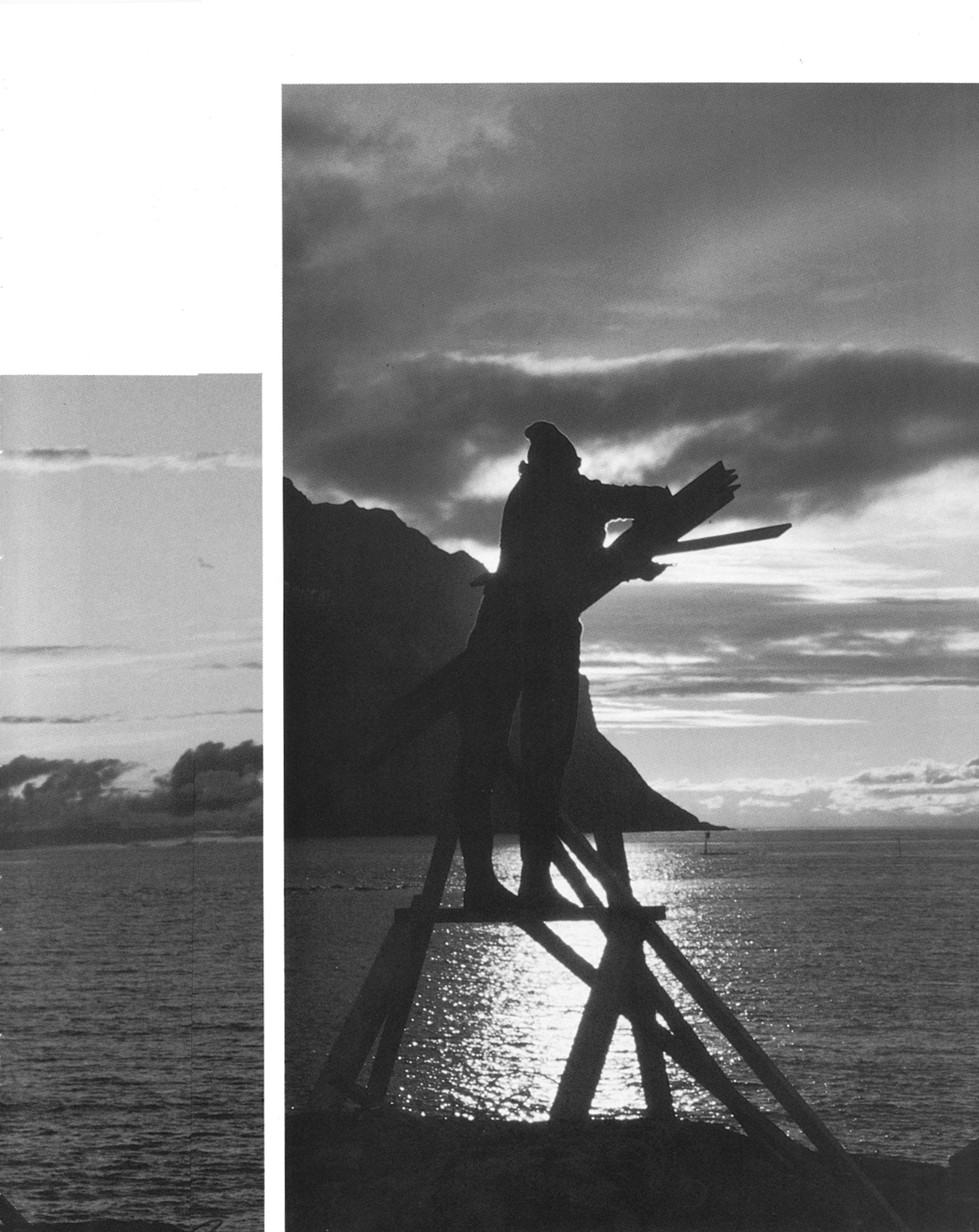 Arbeidet tok ti dager. Havet og vinden sto oss imot. Vi boret presise hull i den harde granitten. Hvert hull fikk ei tugge av dynamitt. Gulrøde søyler sprengte kveldsmørket. Gradvis reiste korset seg på sitt primitive, bevegelige staffeli. Det siste avgjørende rykk, og granitten skrapet stålet inntil foten nådde bunnen. Da sto korset der. Jeg sier ikke av fri vilje farvel til et kors. Det er korset som tar avskjed med meg.
