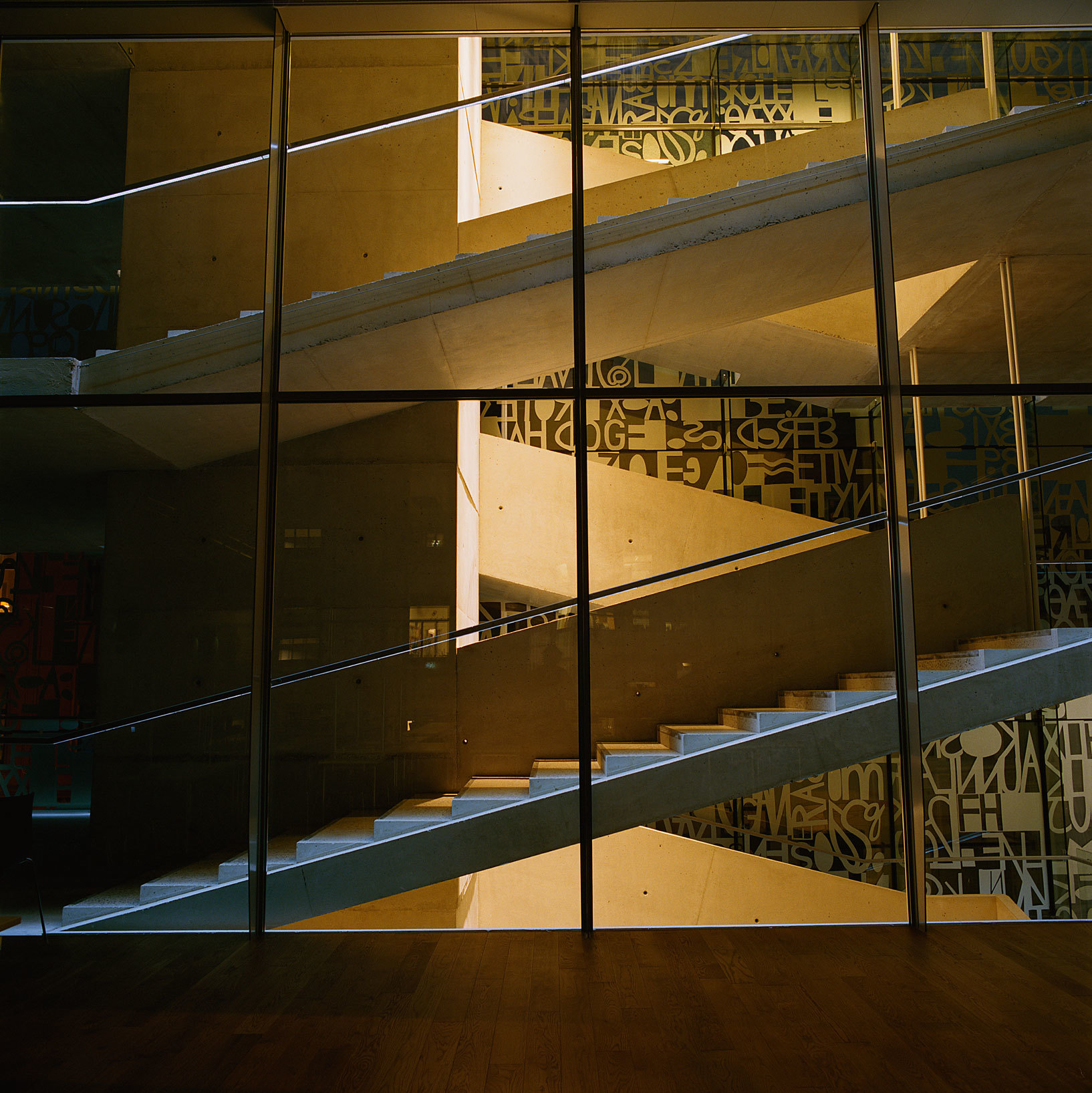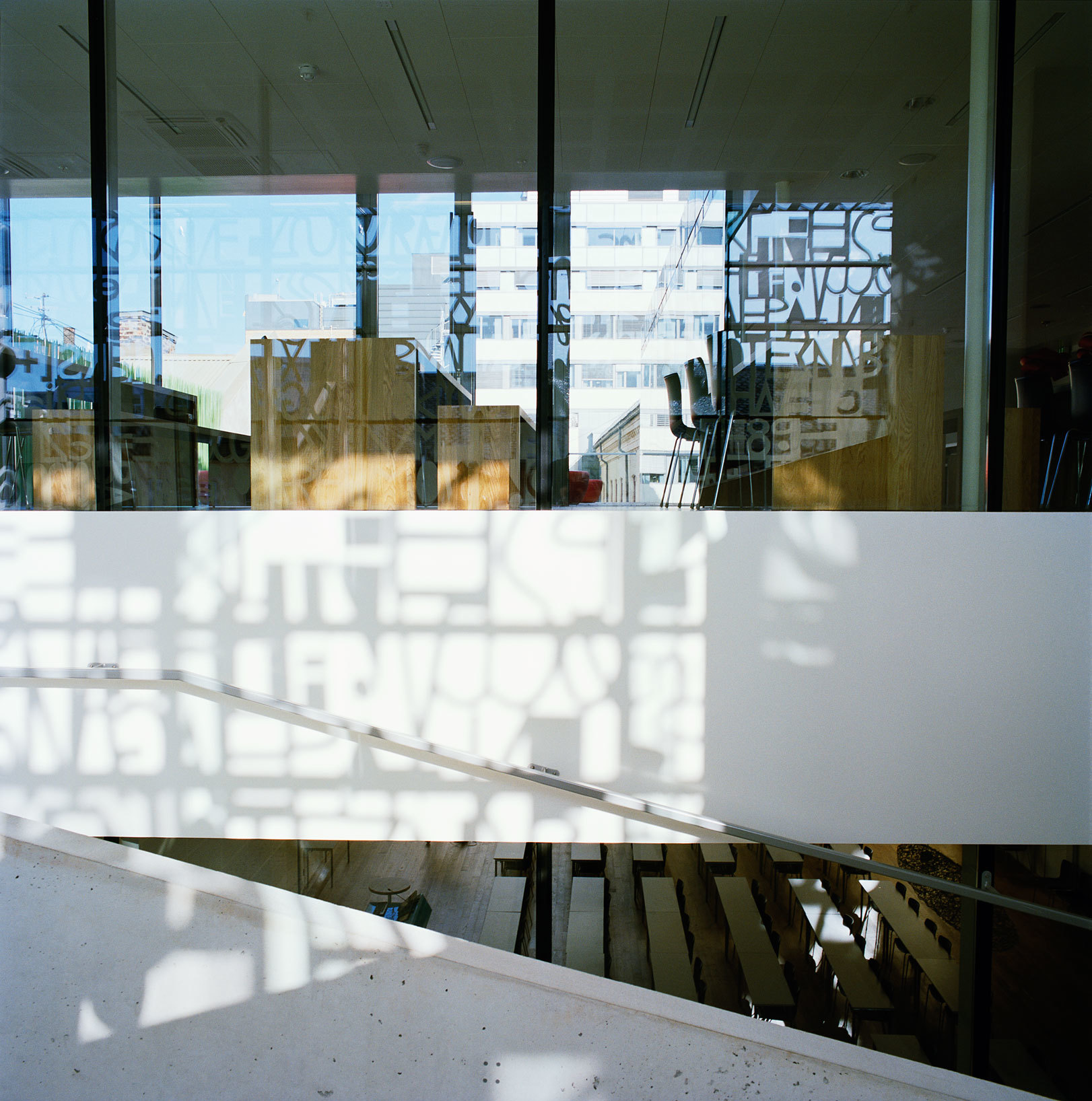 Energy use has been a main focus. The building is a low energy structure with a calculated consumption of 80 kWh/sq.m./year. This is achieved through a solution combining a heat pump, ten energy wells and in-floor water-borne heating/cooling. The building will also supply energy to the existing headquarters. LED lighting throughout, lowers energy requirements. The artwork on the main glazed façade doubles as a sun screen.