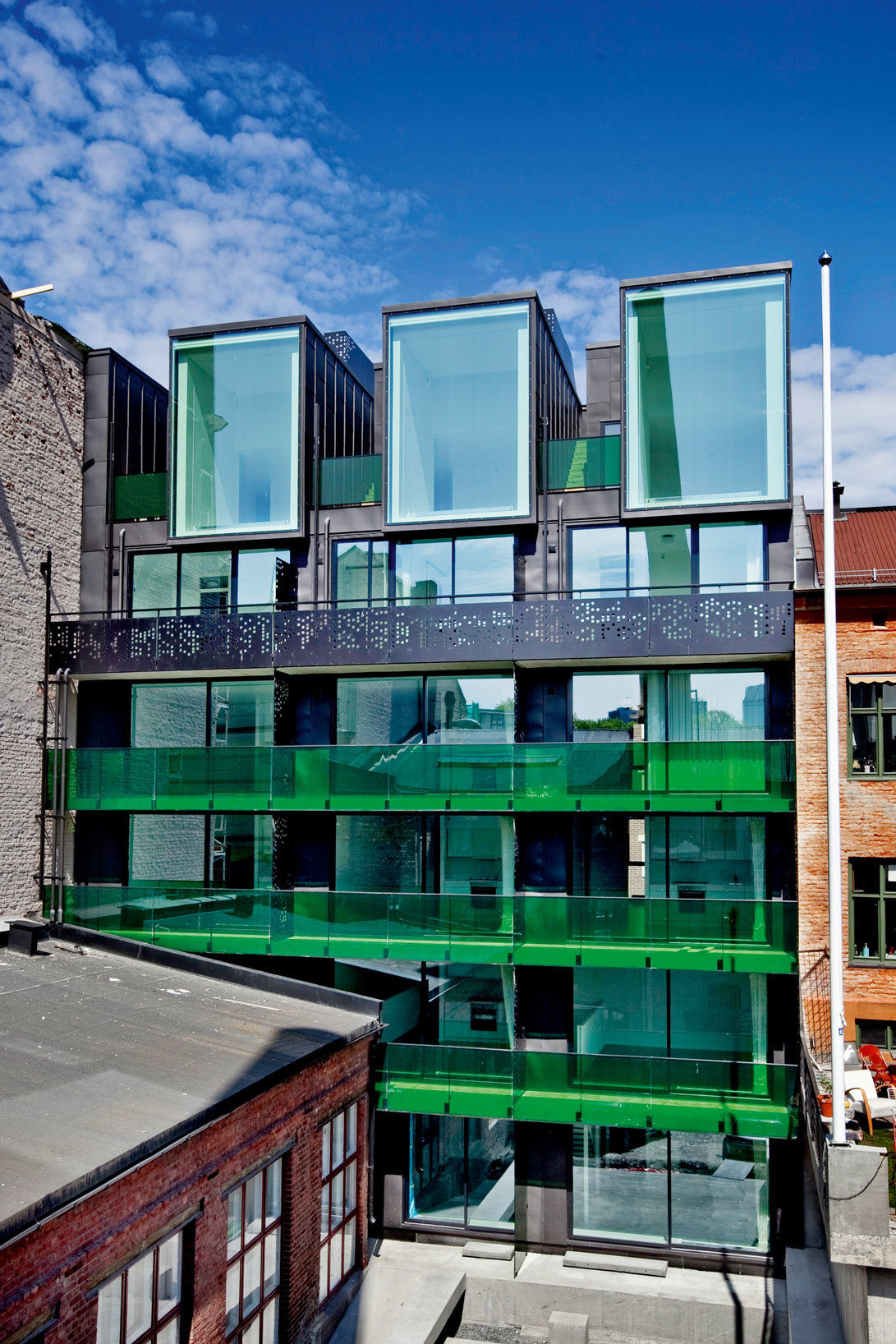 Nybygget har en mer lukket byfasade mot gateløpet i nord, mens det åpner seg med store glassflater mot gårdsrommet og utsikten i sør. På denne måten ligger de fleste leilighetene eksponert rett mot syd, har gjennomlys og gode sikt- og lysforhold. Kjernefunksjoner er plassert sentralt i hver enkelt leilighet.