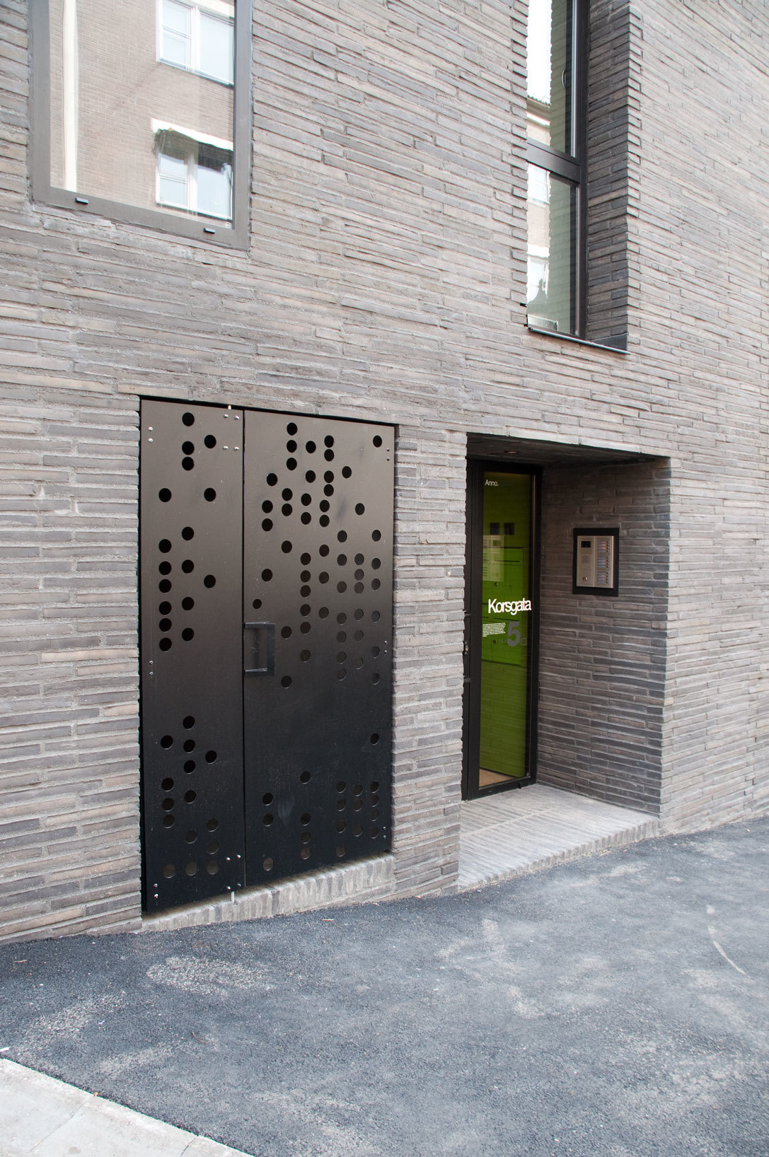 Bygningen er kledd med håndbanket teglsten mot nord og hovedsakelig glass mot syd. I gatefasaden er det brukt avlange, sorte, håndbankede tegl, mens taket og deler av fasaden mot bakgården er kledd med sink.