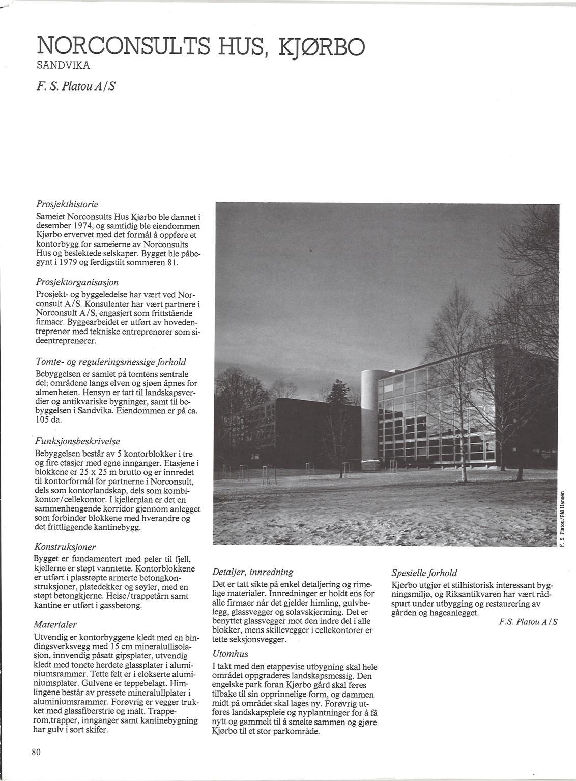 I 2014 ble en del av kontoranlegget på Kjørbo bygget om av Snøhetta og Powerhouse-alliansen til Norges første energipositive transformasjonsprosjekt. Dette er Byggekunsts presentasjon av det opprinnelige bygget, med omtale ved Ketil Kiran. Fra Byggekunst nr. 2-1983.