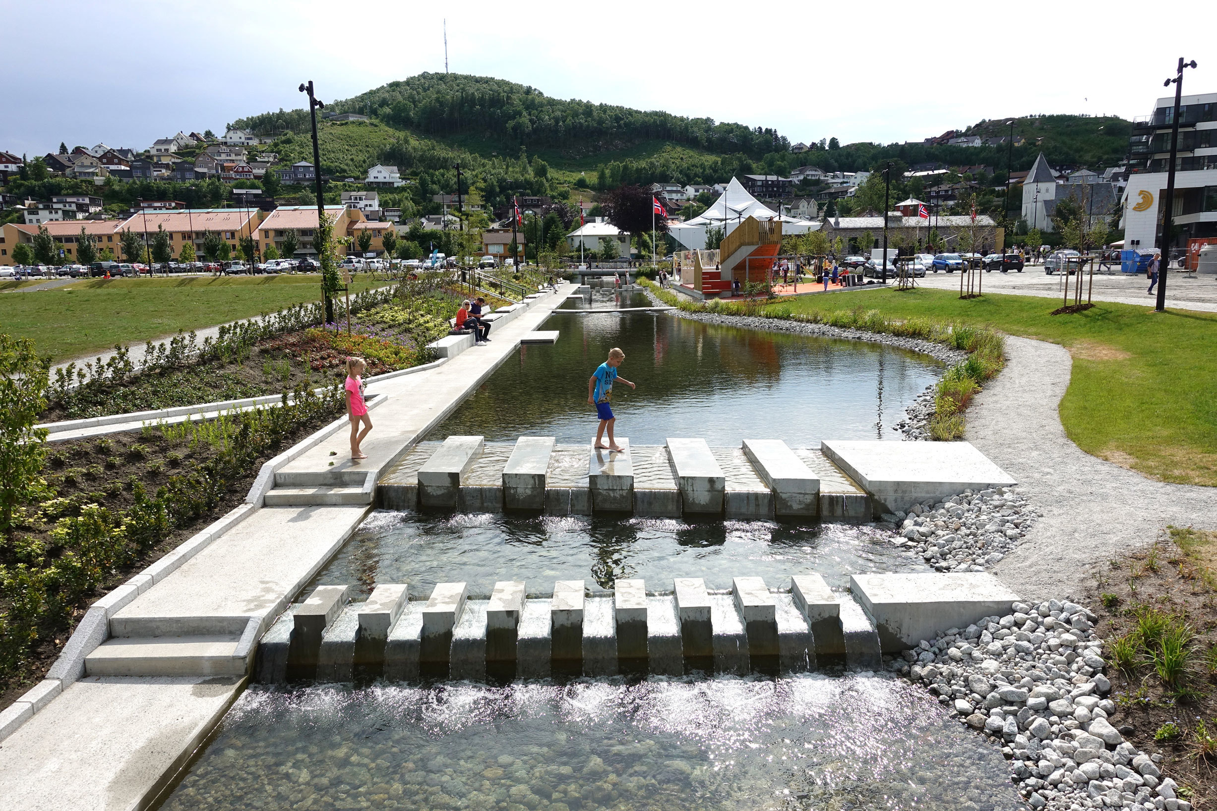 In Ålgård, Dronninga landskap have developed a flood protection park, a beach area, a channel park with cascades and crossing points, a square, and the adjacent Torgveien street.
