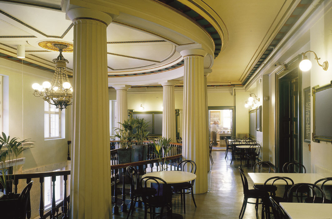 Kafé/kantine er etablert i Grosch-trapperommets annen etasje. Selve rommet er for øvrig uforandret. Enkle møbler med en wienerkafé-karakter er plassert rundt trappeløpet og langs veggene.