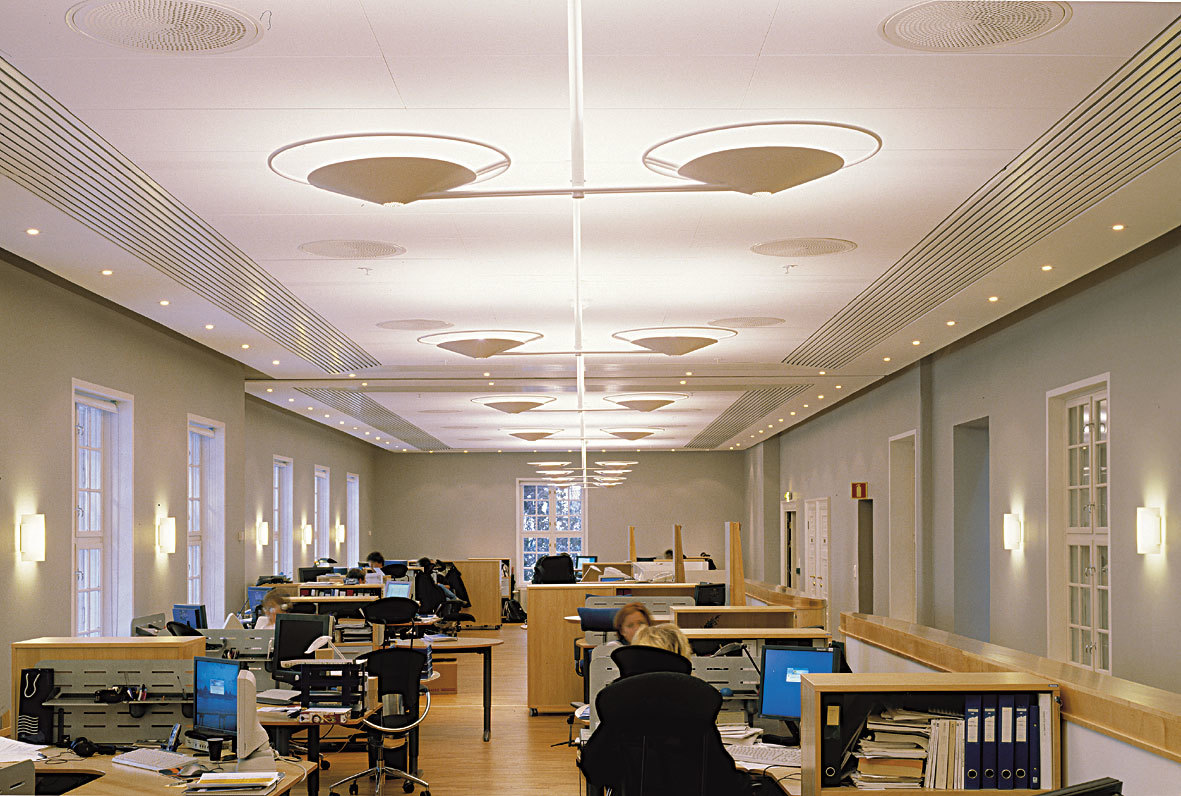 Almenbelysningen består i spesialproduserte uplight-armaturer, montert som pendler i himling, og av små, innfelte downlights. I tillegg er det arbeidslamper på arbeidsplassen.