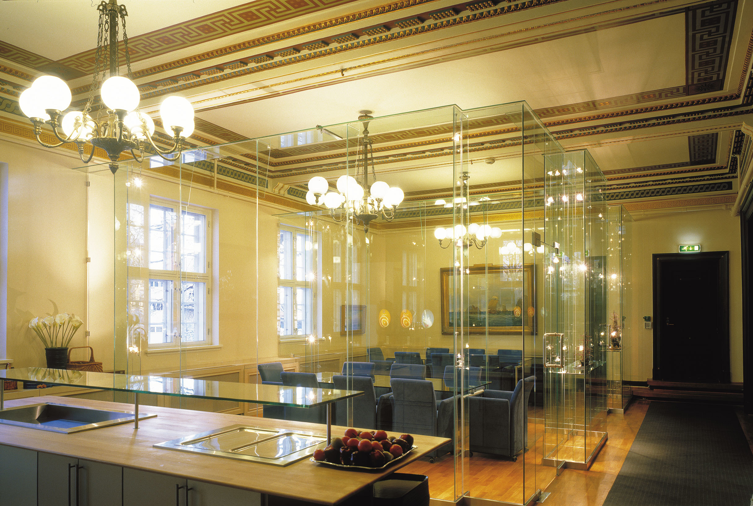 Ved siden av serveringsarealet er det etablert to lunsjstuer av glassvegger med montere for utstilling av antikviteter fra Oslo Børs. Veggene skjermer mot serveringsareal og kommunikasjonssone samtidig som rommets helhet bevares visuelt. Glassveggene er avsluttet et stykke under det dekorerte taket.