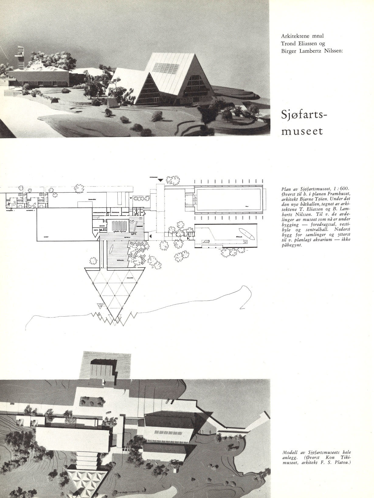 Plan og modellfoto av Sjøfartsmuseet. Planen viser også Framhuset av Bjarne Tøien, Kon Tiki-museet av