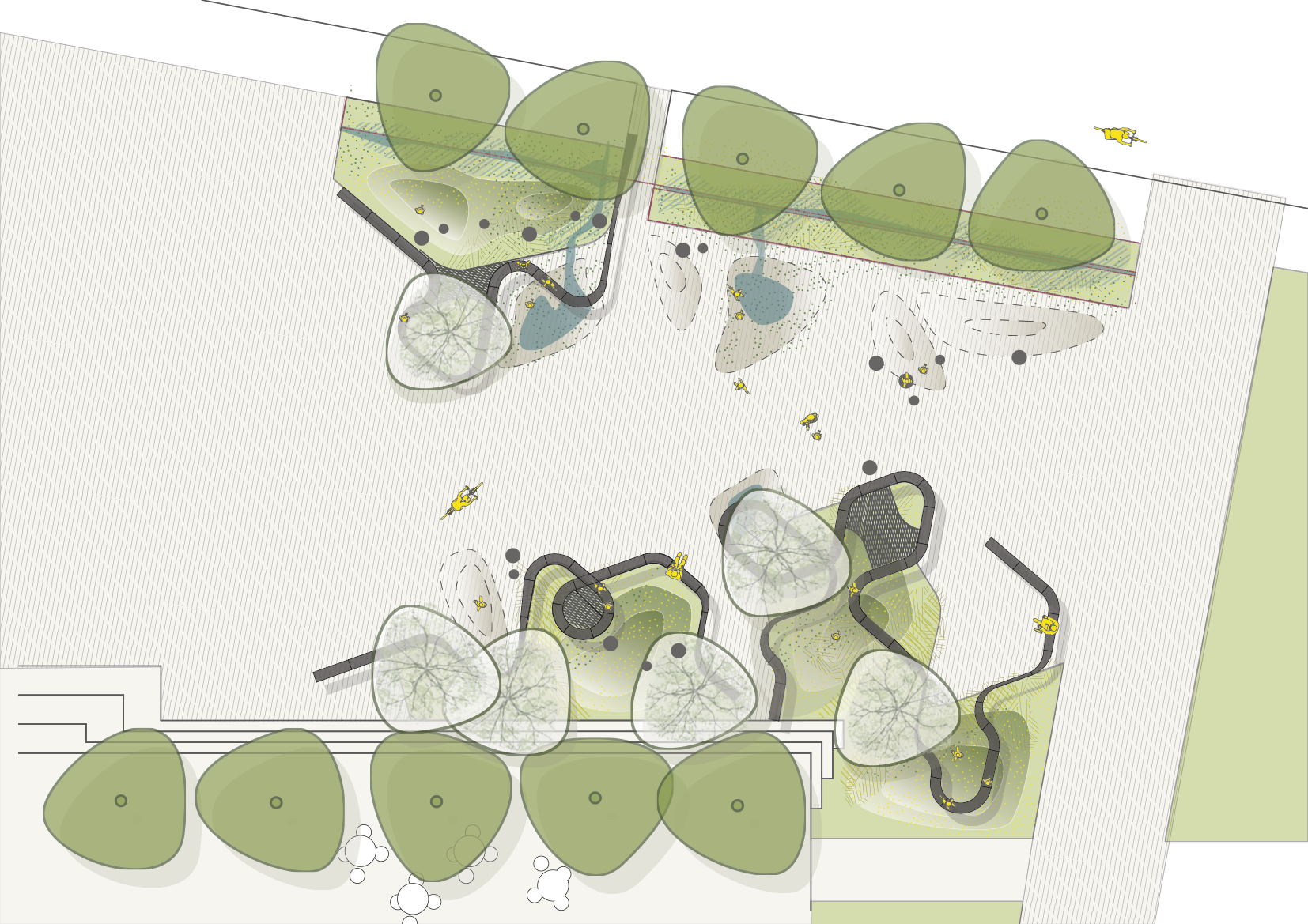 Landskapsarkitektene ønsket å skape et sted hvor både store og små ville ønske å bevege seg og være litt lekne. Resultatet er et -prosjekt hvor alt bølger og det omtrent ikke finnes én rett linje.