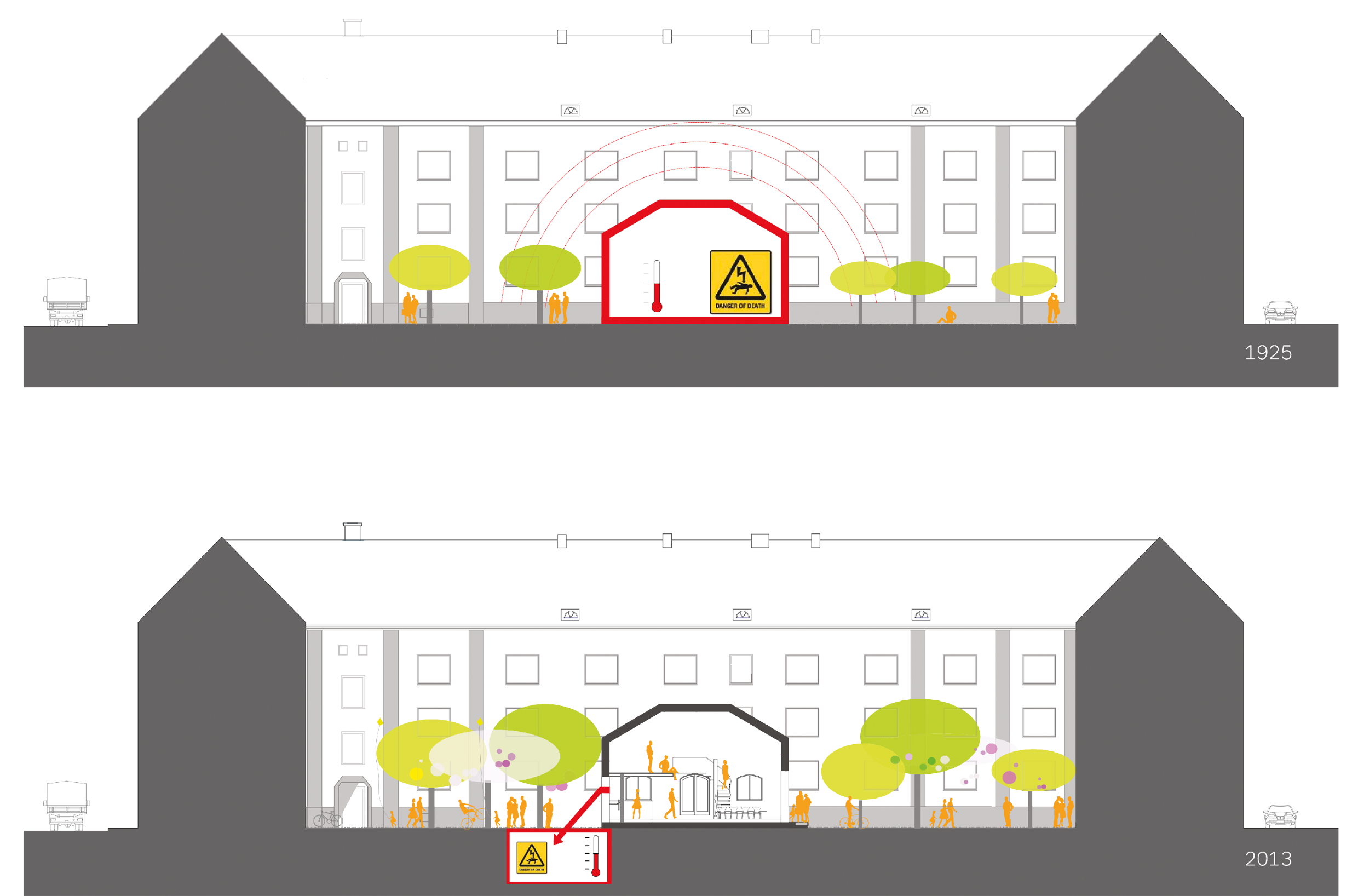 At the heart of a backyard of a housing complex from 1920, a former electri-city substation had been locked for 85 years. With the help of a lot of the local residents, architects Haugen/Zohar initiated a project to move the electrical plant into an underground bunker and transform the substation building into a shared common room for the block.